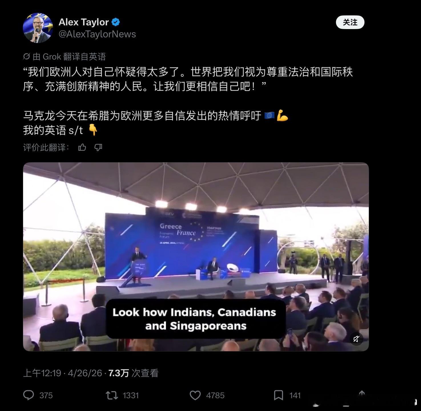 马克龙:“欧洲人要自信,世界把我们视为尊重法治和国际秩序,充满创新精神的人民”。