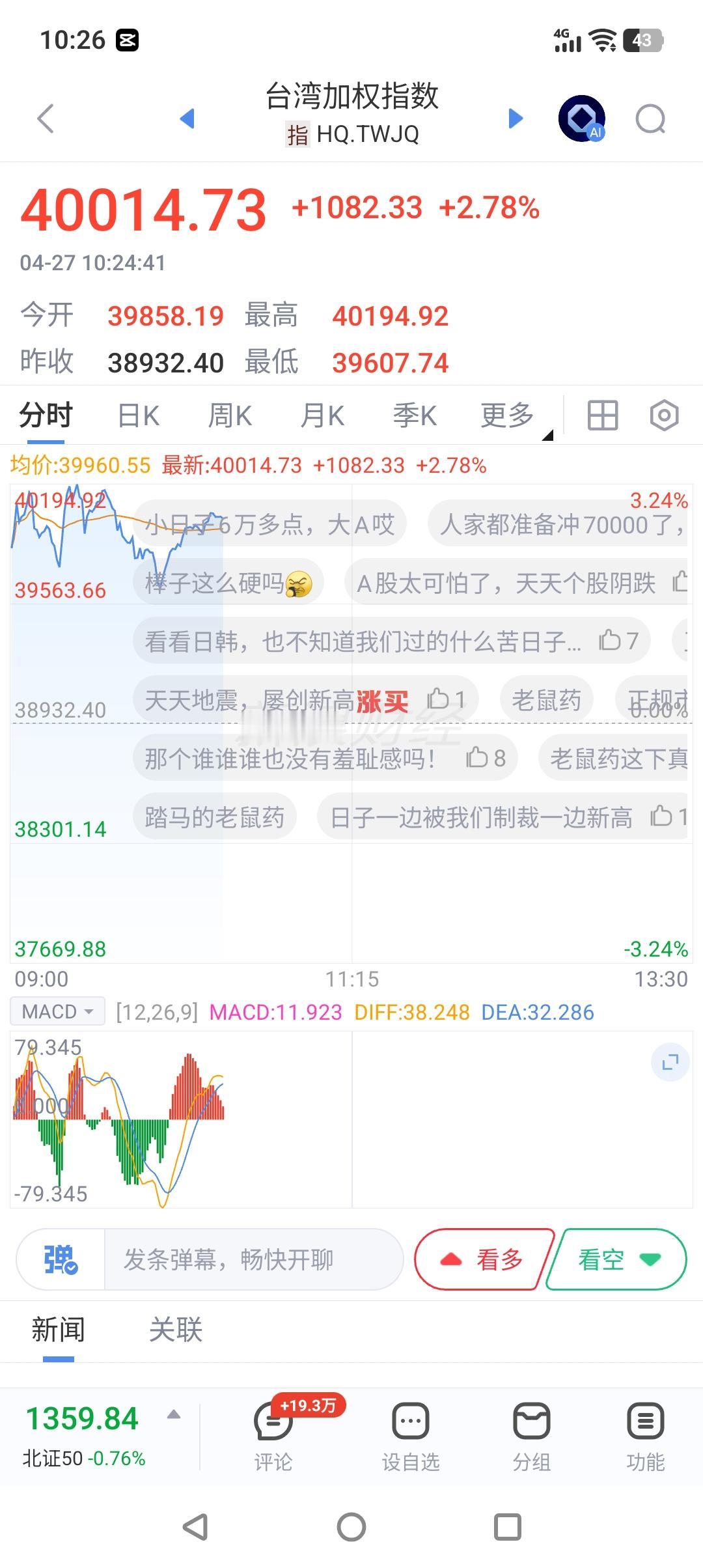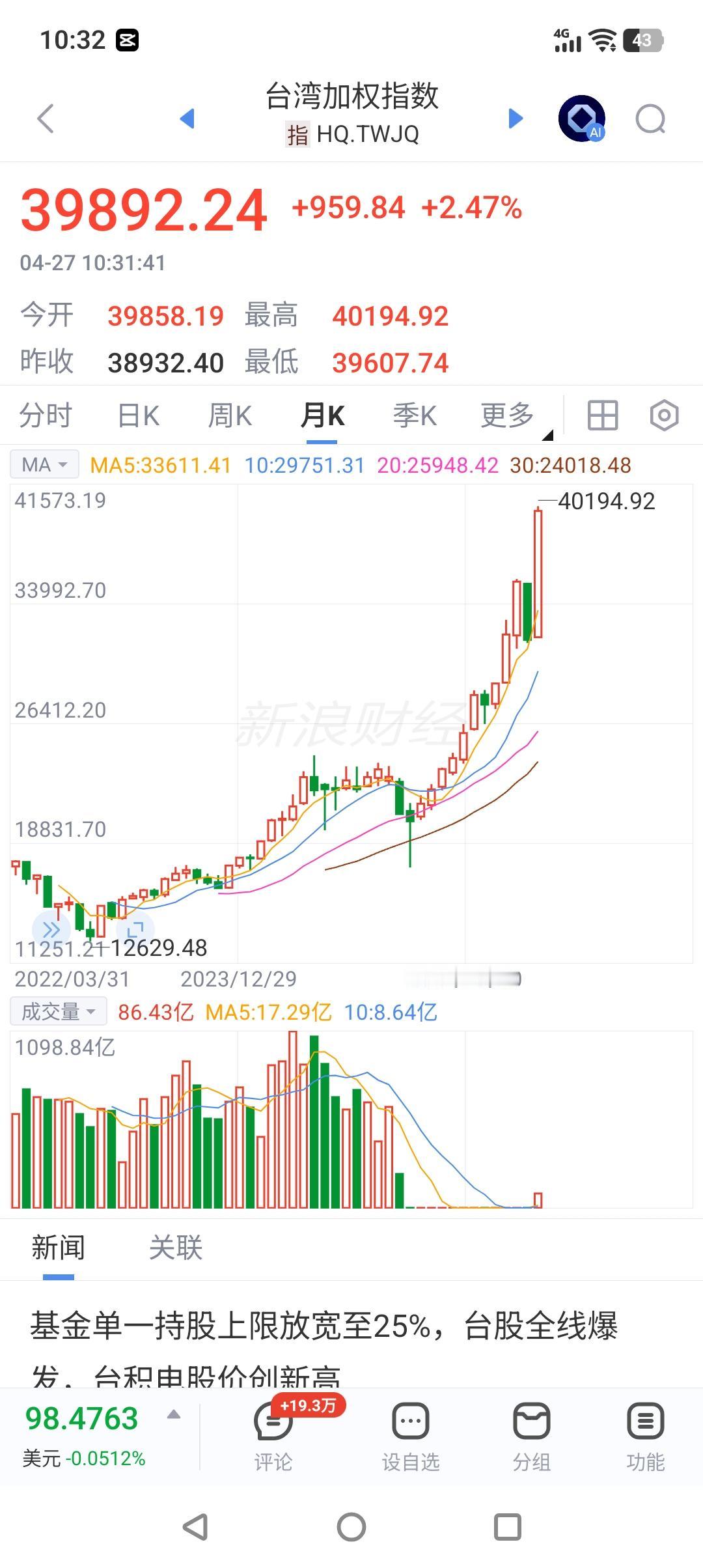 牛气冲天,台湾省的股市指数冲破4万点! 今天上午开盘的台湾省股市,台北加权指数在台积电创新高的带动下一举突破了4万点。今年以来已上涨30%。