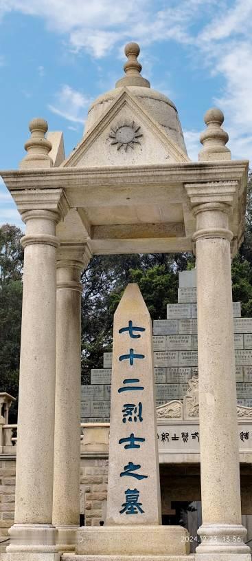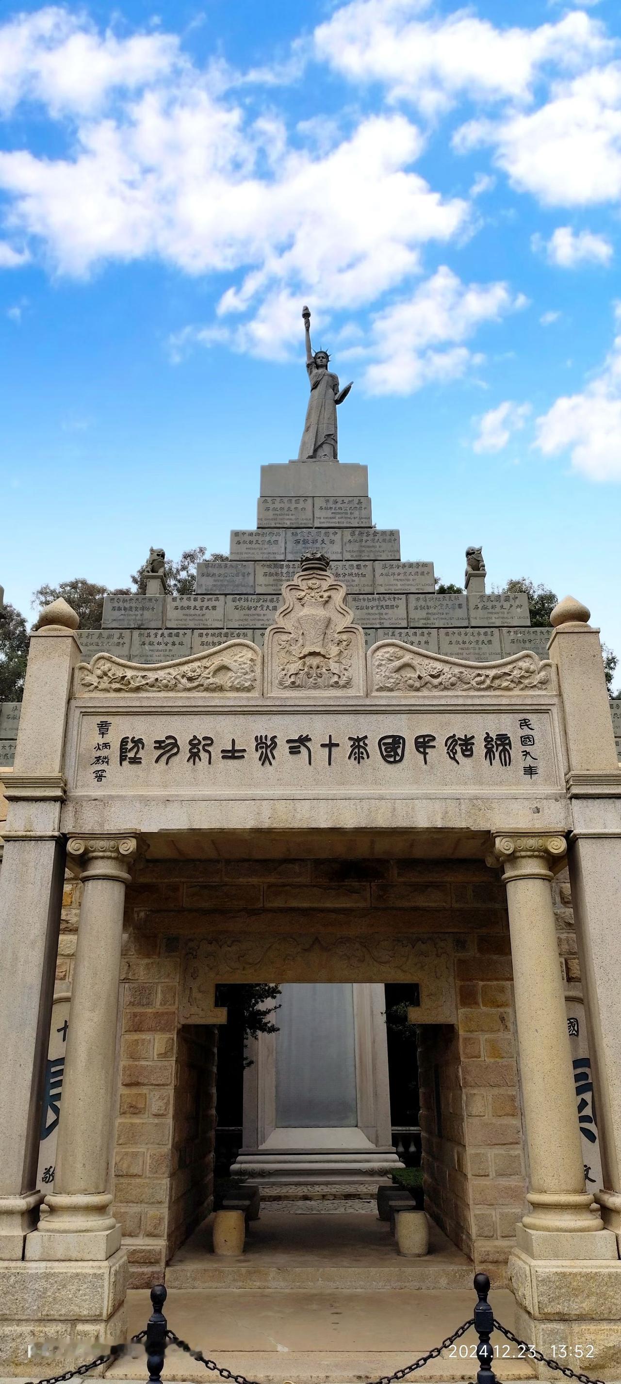 广州黄花岗墓园 纪功坊顶端的自由女神像,由美洲华侨捐资仿纽约女神像雕制,1921年运抵广州安放。女神像高2.4米,左手持《临时约法》,右手高举火炬,脚下两侧立有自由鸟,象征着革命党人对民主共和的追求。这尊雕像在文革期间遭毁,1981年辛亥革命70周年时按原貌重塑。