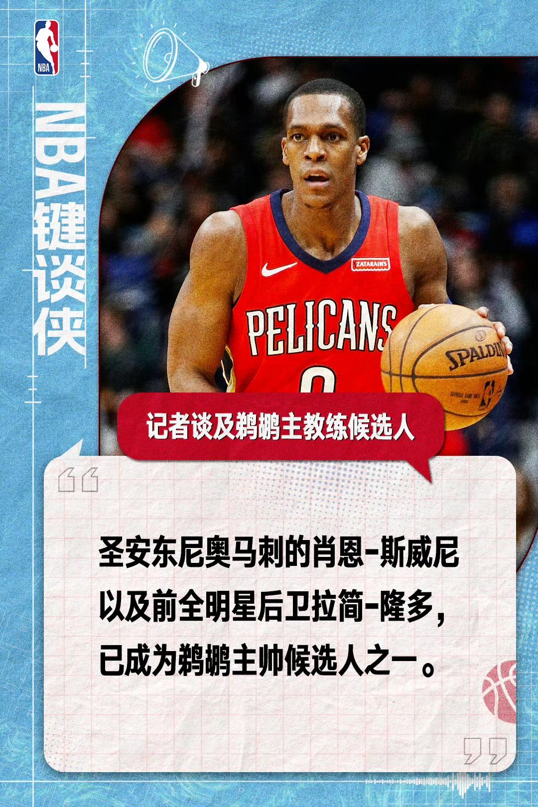 鹈鹕主帅甄选进入关键阶段 隆多与斯威尼成核心候选 北京时间4月27日,据NBA名记Marc Stein等多位联盟消息人士证实,新奥尔良鹈鹕已正式开启主教练选聘工作,马刺首席助教肖恩·斯威尼与前全明星后卫、现雄鹿助教拉简·隆多成为核心候选人。 本赛季鹈鹕仅取得26胜56负,位列西部第11位,无缘季后赛。