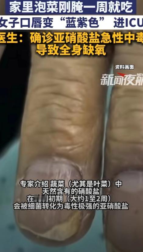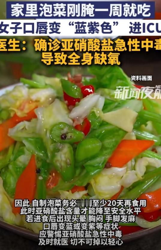 “悲剧还是发生了!”近日,福建,一女子食用腌制一周的泡菜后。没想到,亚硝酸盐急性中毒,口唇变“紫蓝色”,送医住进ICU。 悲剧还是发生了!近日福建,一位女子因为嘴馋,吃了自己在家腌制才一周的泡菜,没曾想,一场危及生命的意外突然降临。 据了解,这位女子平时就喜欢吃泡菜,觉得外面买的不卫生,就自己动手腌制,想着现腌现吃更新鲜,她把各种蔬菜处理好,放进坛子里腌制,才过了7天,就迫不及待地开封了,当天就吃了不少。 吃完没一会儿,女子就觉得不对劲,先是头晕、胸闷,手脚也发麻,紧接着嘴唇开始变成紫蓝色,脸色也变得苍白,呼吸也越来越急促,家人看到她这副模样,吓得魂都快没了,赶紧拨打急救电话,把她送到医院抢救。 送到医院后,医生紧急检查,确诊她是亚硝酸盐急性中毒,全身都处于缺氧状态,情况十分危急,直接被送进了ICU进行监护治疗,目前还在接受进一步救治。 其实很多人都有和这位女子一样的误区,觉得自己腌的泡菜,只要腌几天入味了就能吃,殊不知这正是最危险的时候。 说白了,咱们平时吃的蔬菜里,本身就含有硝酸盐,在腌制的时候,这些硝酸盐会被细菌转化成亚硝酸盐,这种物质毒性特别强。 根据医院专家的说法,泡菜腌制的前1到2周,正是亚硝酸盐含量的高峰期,这时候吃,很容易引发中毒,成人只要摄入0.2到0.5克亚硝酸盐,就可能出现中毒症状,严重的甚至会致命。 而这位女子,就是刚好在最危险的时间段吃了泡菜,才酿成了这样的悲剧,我猜这位女子大概率也不知道腌制泡菜还有这么多讲究,可能只是跟着网上的教程随便腌,觉得只要腌熟、入味就可以了,根本没考虑到亚硝酸盐的问题。 毕竟平时咱们在家做饭,谁也不会特意去查腌制食物的安全时间,总觉得自己做的就一定安全,这件事也给咱们所有人提了个醒,自制泡菜虽然干净卫生,但一定要耐住性子。 一般来说,泡菜至少要腌制20天以上,亚硝酸盐的含量才能降到安全水平,这时候吃才放心,如果实在等不及,也千万别在腌制一周左右这个“危险期”开封,不然很容易出问题。 另外还要注意,要是吃完腌制食物后,出现头晕、胸闷、口唇变紫的情况,一定要赶紧就医,别当成普通的肠胃不舒服拖延,耽误了最佳救治时间。 一场小小的泡菜,差点酿成无法挽回的悲剧,实在让人揪心,希望这位女子能早日脱离危险,也希望大家能记住这个教训,以后吃自制腌制食物,一定要等够时间,别因小失大。 (信息来源: 新闻夜航)