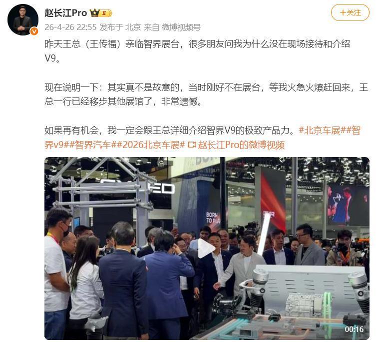 赵长江回应没接待前老板王传福:其实真不是故意的,当时刚好不在展台,等我火急火燎赶回来,王总一行已经移步其他展馆了,非常遗憾。
