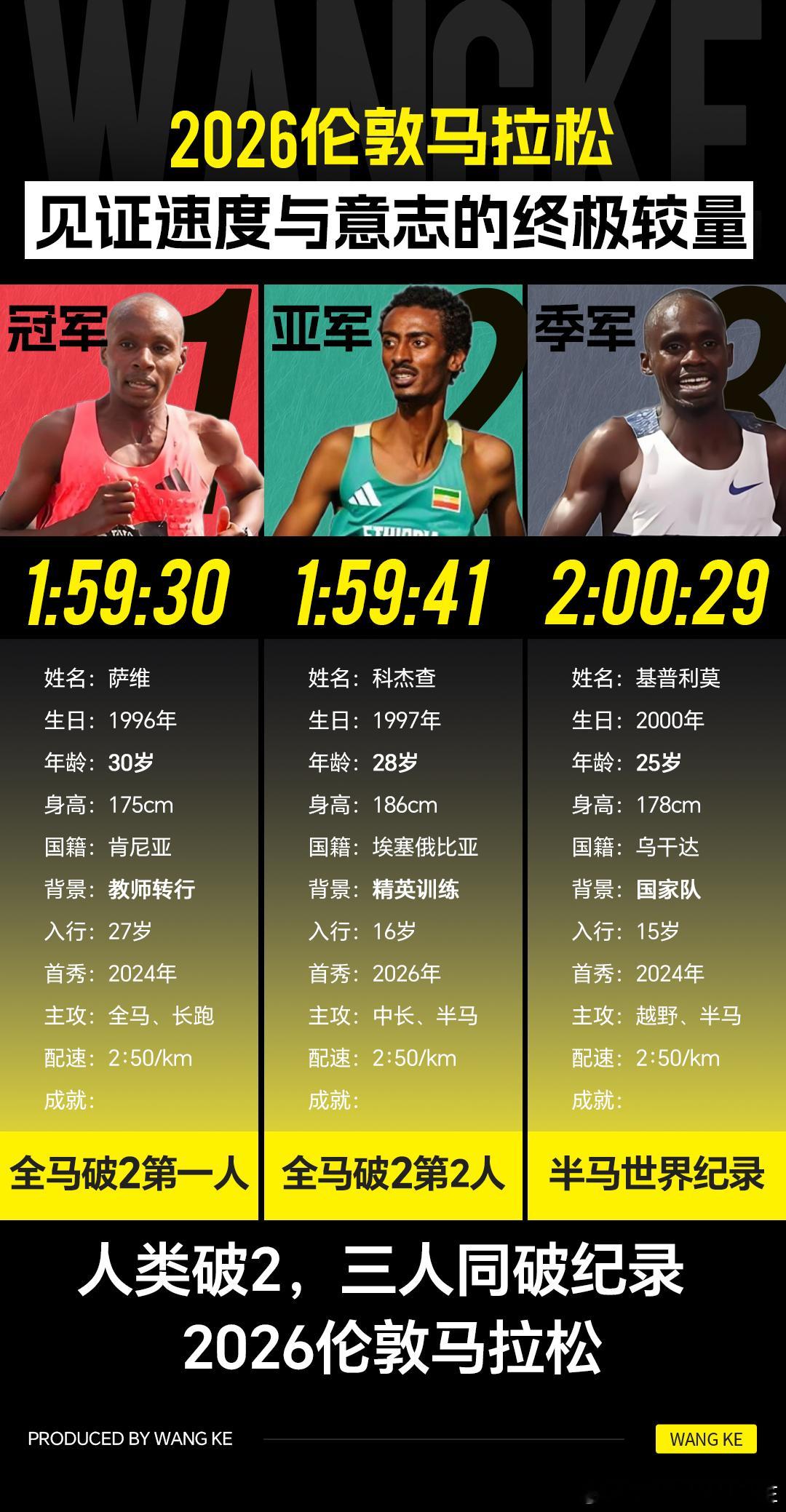 看完这场比赛直接起鸡皮疙瘩!2026伦敦马拉松直接把人类极限焊死在新高度男子组前三直接把“破2”变成日常操作:冠军萨维:1:59:30,人类正式比赛全马破2第一人!亚军科杰查:1:59:41,首马就破2,这天赋简直离谱!季军基普利莫:2:00:29,半马世界纪录保持者也跑进2小时大关!同样的2:50/km配速,却跑出了改写历史的成绩!尤其是萨维,27岁才转行跑步,30岁就站上了人类之巅,谁看了不说一句励志天花板!科杰查16岁就开启精英训练,首秀就封神;基普利莫15岁入行,从越野跑一路杀到马拉松,每一步都在刷新人类对“速度”的认知。当三个人同时冲线,我才真正明白什么叫“人类无极限”!
