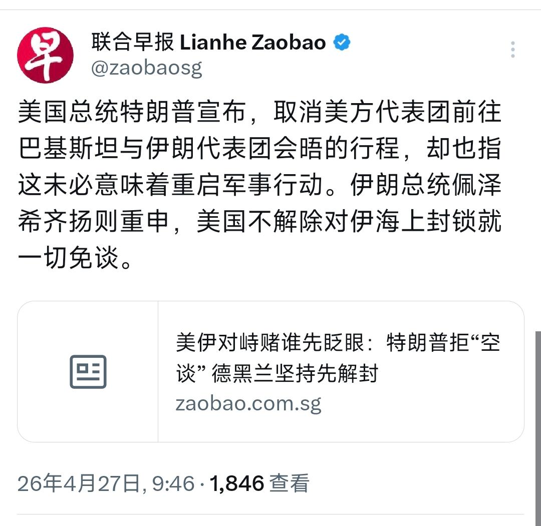 外媒今天(4月27日)报道:“美国总统特朗普宣布,取消美方代表团前往巴基斯坦与伊朗代表团会晤的行程,却也指这未必意味着重启军事行动。伊朗总统佩泽希齐扬则重申,美国不解除对伊海上封锁就一切免谈。” [机智]评几句:这出“取消行程”的戏码,本质是极限施压遇上死守底线的僵局表演。特朗普取消代表团赴巴,嘴上说“未必重启军事行动”,实则摆出“想谈得你来找我”的傲慢姿态,试图用“取消会晤”作为筹码逼伊朗在核问题上松口。而伊朗总统佩泽希齐扬直接把“解除海上封锁”设为谈判前提,寸步不让。双方都在玩“谁先眨眼”的游戏:美国想用军事高压换外交屈服,伊朗则用“不解封免谈”来反制。眼下这局面,要么有一方在底线上崩盘,要么就是继续耗下去,看谁先扛不住封锁或国内压力。