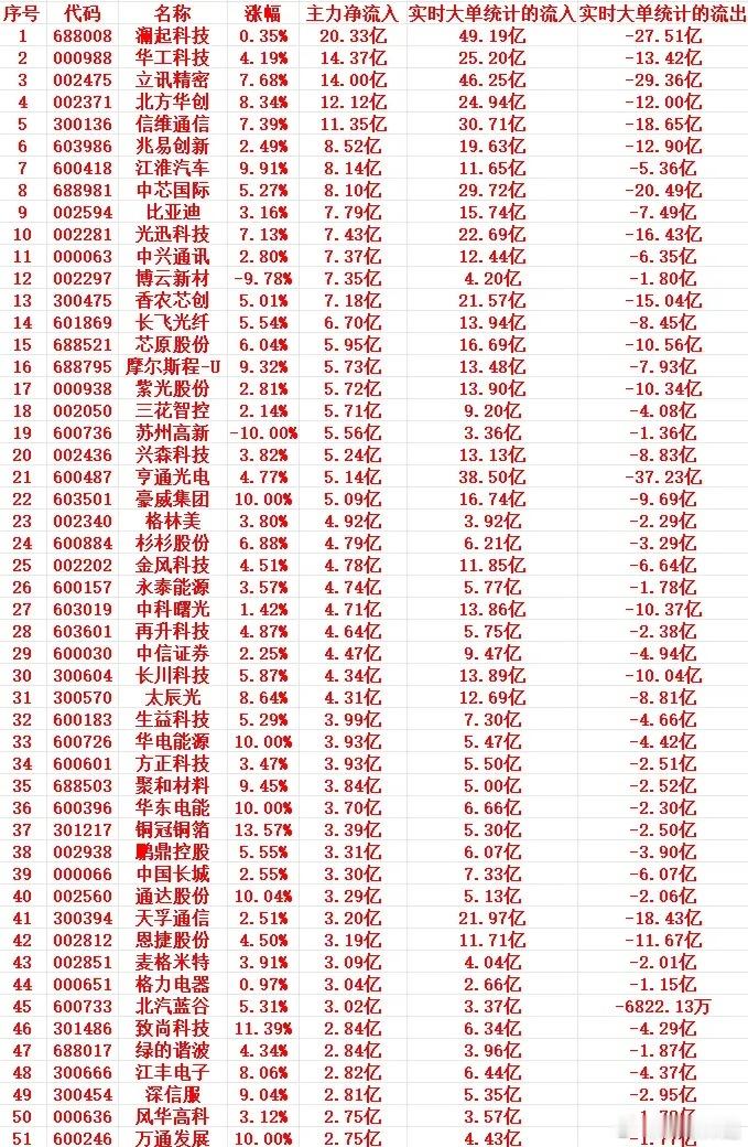 1 688008 澜起科技 0.35% 20.33亿 49.19亿 -27.51亿2 000988 华工科技 4.19% 14.37亿 25.20亿 -13.42亿3 002475 立讯精密 7.68% 14.00亿 46.25亿 -29.36亿4 002371 北方华创 8.34% 12.12亿 24.94亿 -12.00亿5 300136 信维通信 7.39% 11.35亿 30.71亿 -18.65亿6 603986 兆易创新 2.49% 8.52亿 19.63亿 -12.90亿7 600418 江淮汽车 9.91% 8.14亿 11.65亿 -5.36亿8 688981 中芯国际 5.27% 8.10亿 29.72亿 -20.49亿9 002594 比亚迪 3.16% 7.79亿 15.74亿 -7.49亿10 002281 光迅科技 7.13% 7.43亿 22.69亿 -16.43亿11 000063 中兴通讯 2.80% 7.37亿 12.44亿 -6.35亿12 002297 博云新材 -9.78% 7.35亿 4.20亿 -1.80亿13 300475 香农芯创 5.01% 7.18亿 21.57亿 -15.04亿14 601869 长飞光纤 5.54% 6.70亿 13.94亿 -8.45亿15 688521 芯原股份 6.04% 5.95亿 16.69亿 -10.56亿