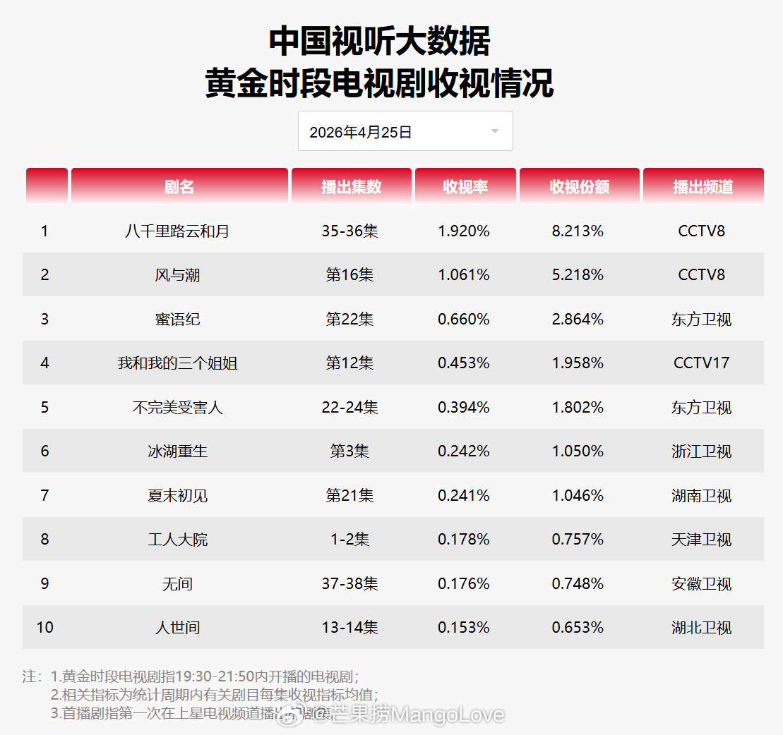 2026年4月25日中国视听大数据CVB黄金档电视剧收视率日榜TOP101 八千里路云和月 CCTV82 风与潮 CCTV83 蜜语纪 东方卫视4 我和我的三个姐姐 CCTV175 不完美受害人 东方卫视6 冰湖重生 浙江卫视7 夏末初见 湖南卫视8 工人大院 天津卫视9 无间 安徽卫视10 人世间 湖北卫视