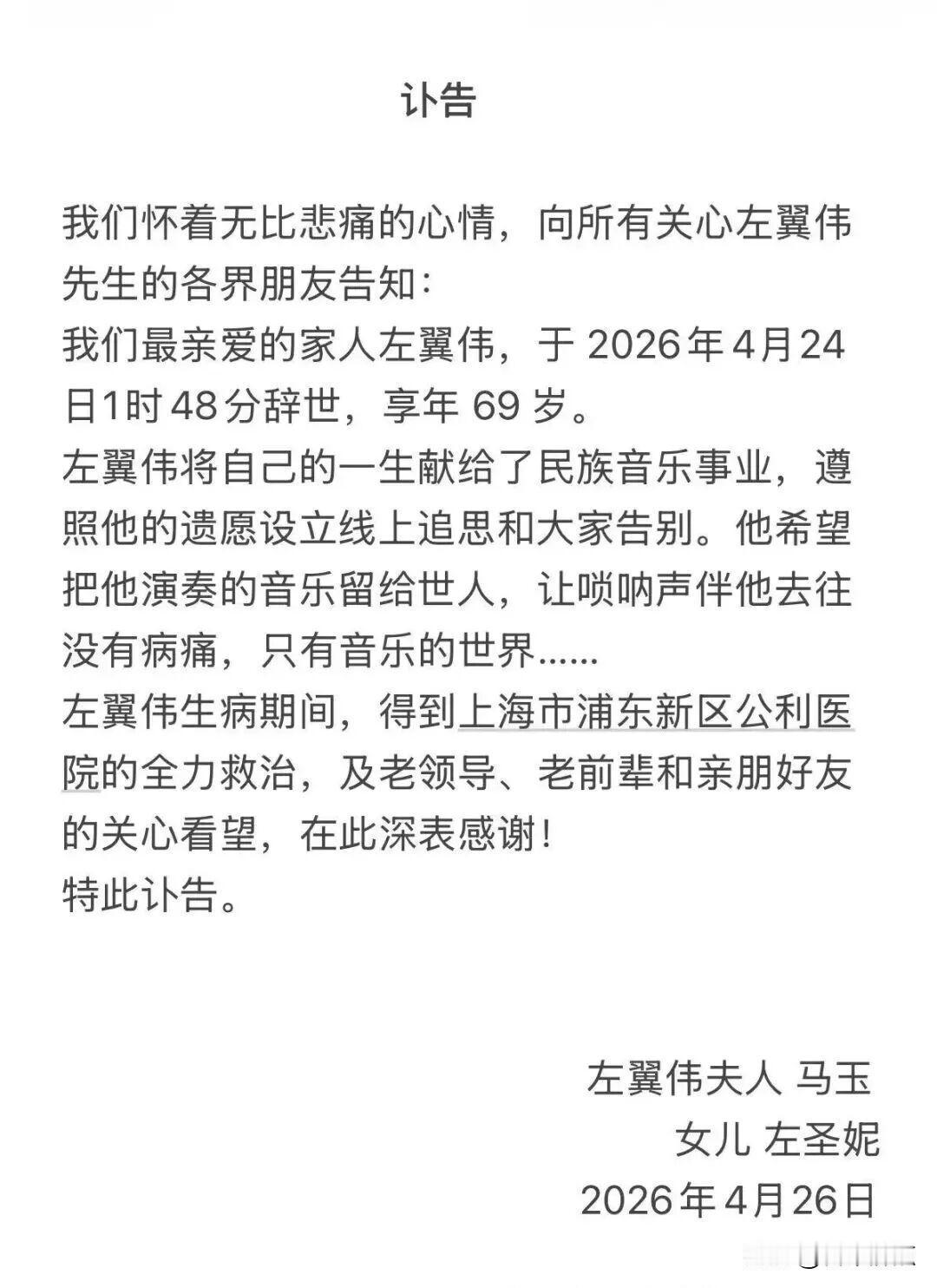 唢呐还在响,大师却走了,最后一曲吹给谁听。 左翼伟老师没了,69岁,上海,4月24日凌晨一点多走的。不是什么意外,就是身体撑不住了。可他走之前还在改一个学生吹《黄河谣》的气口,手机里存着三段语音留言,都是教怎么压住高音不破音。 他吹唢呐五十多年,从甘肃戈壁滩的边防连队吹到维也纳金色大厅,没换过乐器,但改过吹法。不靠嗓子硬顶,是把武术里的腹式呼吸、声学里的共振点、甚至中医讲的“气沉丹田”全揉进去了。别人说他是天赋好,他总摆手:“我练气那会儿,每天对着沙尘暴吹两小时,嘴肿得喝不了粥。” 他不光吹唢呐,还吹管子、筚篥,连萨克斯都试过。不是玩票,是想听听不同管子怎么“说话”。《云山如梦》得了台湾金唱片奖,其实里面那段主旋律,最早是他教老年大学阿姨们用改良唢呐吹出来的。 他写了四部唢呐协奏曲,名字都硬气:《大风歌》《敦煌魂》《气冲霄汉》……可最让人记住的,反而是《乔家大院随想》里那一段慢板,像在讲一个山西汉子把钱庄开到蒙古的故事。没人想到唢呐还能这么“说人话”。 他配过一百多部影视剧的乐,不是只在片尾字幕里挂个名——西北的风沙声、江南小巷的雨滴声、菜市场早上剁肉的节奏,好多都是他用唢呐模出来的音。观众未必知道是谁吹的,但耳朵记住了。 他教学生从不摆架子。上海音乐学院附中、社区活动中心、还有浦东一个快递站工会的民乐角,他都去。学生拿奖他从不发朋友圈,倒是把每届市赛金银奖名单打印出来,贴在琴房门后,底下写一行小字:“练对了气,比拿奖重要。” 他当着中国民族管弦乐学会常务理事,但最常干的是蹲在教材出版社改唢呐分级标准。说白了,就是让十岁的孩子知道从哪口气开始学,让六十岁的退休教师知道怎么不伤喉咙还能吹出味儿来。 他最后一条微信,发给徒弟:“《气冲霄汉》第四乐章的颤音,别学我老办法,试试左手微压孔,音更稳。”发完不到六小时,人就走了。 唢呐还在响。 他教的学生今天下午在静安寺地铁站口吹了一小段《黄河谣》。 人围了三层。