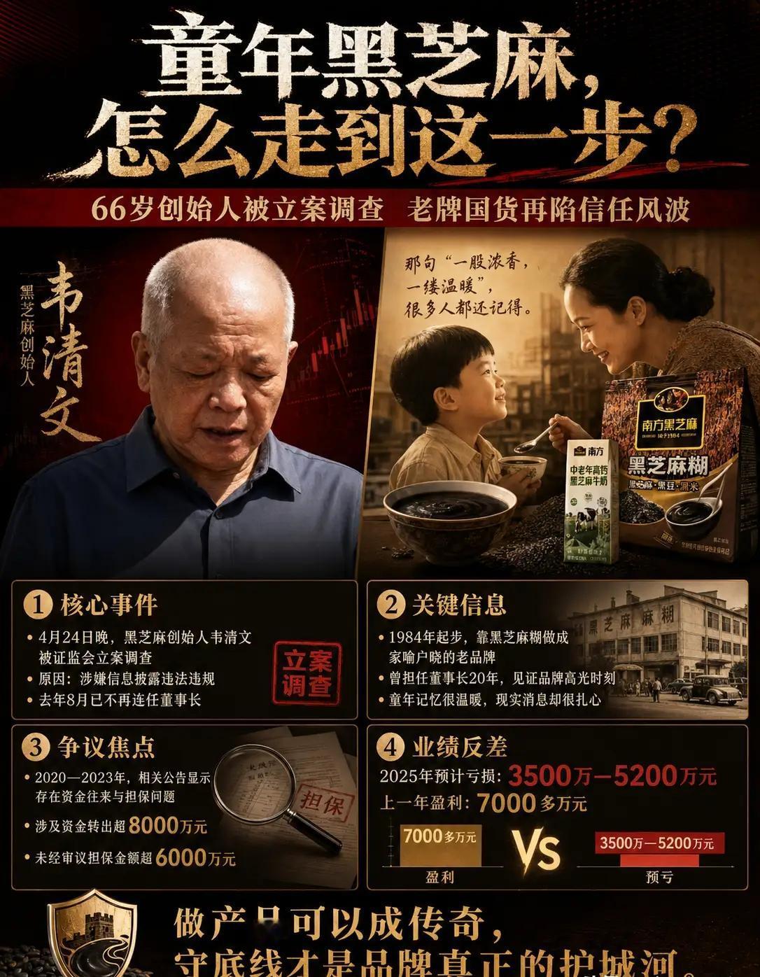 刷到黑芝麻糊翻车, 我算了一笔账, 不是味儿变了,是心变了 黑芝麻创始人韦清文被立案调查,66岁,卸任快两年了,还是没跑掉。公告说涉嫌信息披露违法违规。去年还赚钱,今年直接预亏几千万,这反差比小时候喝的糊还稠。 我刷到这条,第一反应不是可惜,是算账。四十年老牌子,从小喝到大,多少人冬天早上就靠那一碗热乎的。你跟我说创始人违规担保、资金占用,去年刚被交易所公开谴责,今年就立案?那你会干啥?会熬糊? 后来我一琢磨,这牌子翻车,不是味儿变了,是心变了。 你想想,韦清文20岁和俩兄弟3万块钱起家,从广西村里的小作坊做到上市公司,巅峰时全国糊类食品六成市场是他们的。“一股浓香,一缕温暖”,那是多少人童年冬天的念想。可这些年,他不琢磨怎么把黑芝麻糊做好,去搞资本游戏:2020到2023年,控股股东及关联方非经营性占用资金超8300万,违规担保6500多万。心思不在产品上,账能不出事? 更扎心的是配料表。有网友扒出来,黑芝麻排第四,前三是谷物、葡萄糖、麦芽糊精。你卖的是黑芝麻糊还是米粉糊?消费者不是傻子,配料表掺水,情怀就得打折。销量从2014年的九百五十多万件,跌到如今。 这让我想起身边有些老牌子,仗着大伙儿信任,开始偷工减料、玩金融、搞跨界,正事不干,杂事一堆。最后呢?消费者不买账了,口碑塌了,自己还觉得委屈:我这么多年老牌子,你们怎么不支持? 黑芝麻糊这事,不是市场竞争太激烈,是创始人自己把路走窄了。你想啊,一个做食品的,不好好研究怎么让糊更香、更纯、更健康,天天琢磨怎么从股市捞钱、怎么违规担保,这不就是忘本吗? 创业者最怕的,不是对手太强,是自己把当年的初心给忘了。你让消费者怎么敢再买回去给家里人喝? 因为配料表和创始人丑闻,你还会买黑芝麻糊吗?