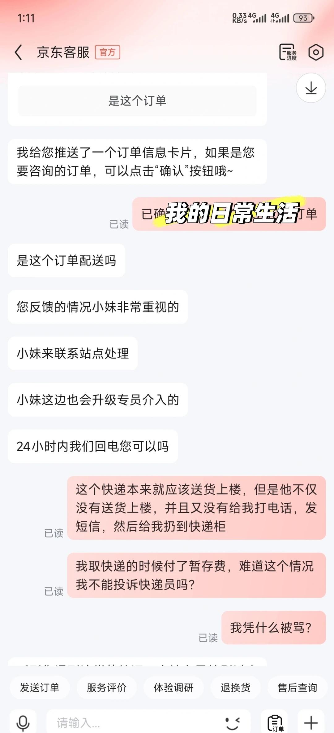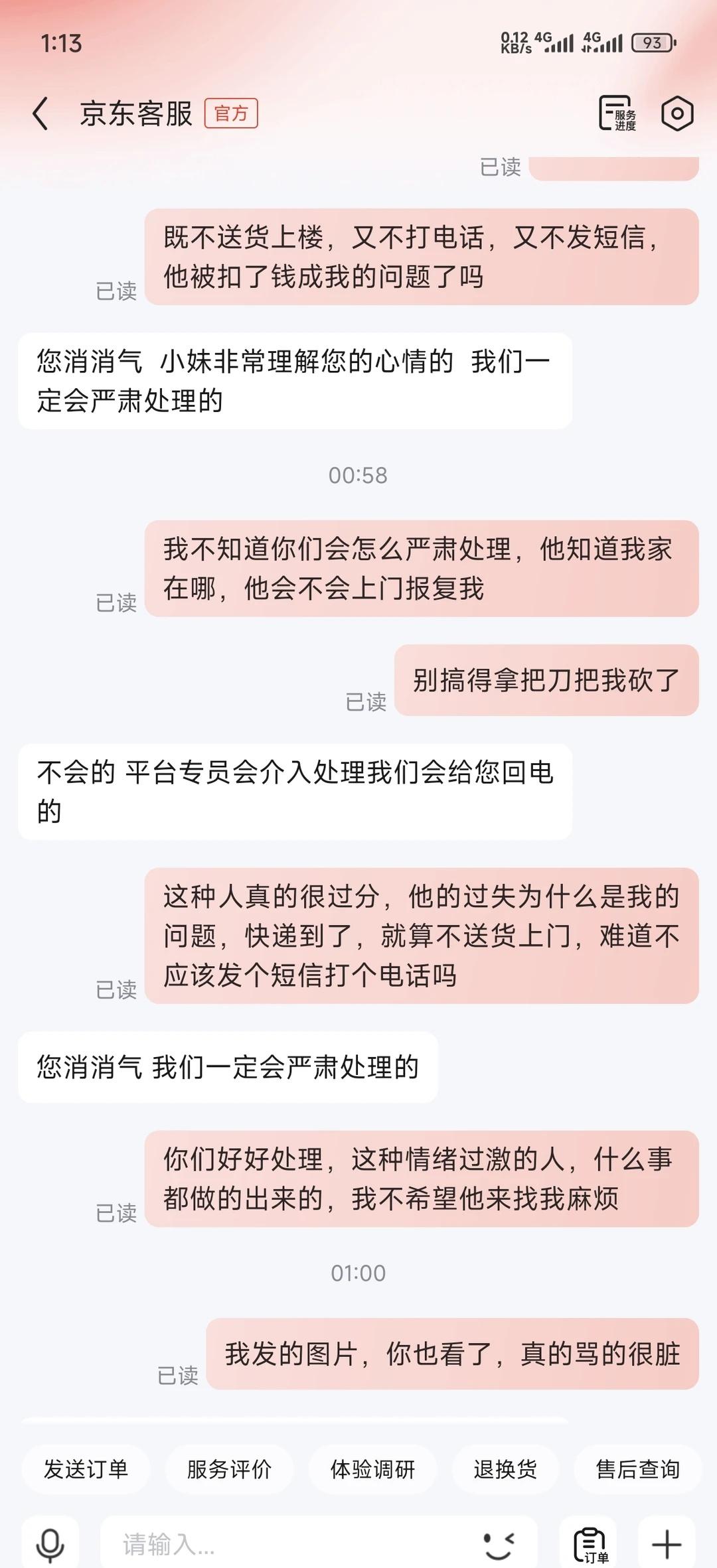京东快递员辱骂消费者后续 结果:快递员已为自己的言行负责。 事情经过:快递直接给我扔暂存柜,既没有短信通知,也没有电话通知。我4月15日发现去拿的时候付了暂存费,然后就找客服投诉了。若不是在没有任何通知的情况下导致快递超时付了暂存费,我不会去投诉,几块钱不多,但不应该我付。 4月16日投诉完了以后他说可以帮我付暂存费,我以为他知道自己的过失了,那时我已经不追究了,没让他给我付暂存费,然后到了4月19日晚上突然发短信过来辱骂。我不惹事也不怕事,他既然说出这些话,那我不能当做没看见。然后我进行二次投诉,成年人该为自己的言行负责,要想到自己口嗨会承担什么样的后果。 觉得不爬楼很正常的,7楼的住户不止我一家,每天都有送外卖和送快递的上来,都是工作赚钱为生活,真做不来可以换工作。 4月23日更:京东客服电话联系,告知已经对快递员再次进行罚款及扣分处罚,让快递员登门道歉且保证快递员不会再对我进行打扰。我表示不用上门道歉并不再追究,他为自己的口嗨行为负责就行了,道不道歉我不稀罕。 4月24日更:快递员被二次处罚后,没有再打扰我的生活。本来也是因为他对自己的工作不负责和态度恶劣引起的事,他承担了对应后果就行。 4月25日更:今天的快递有给我打电话询问并送货上楼,做好自己的本职工作,没人会投诉。 另外说下京东的优势就是送货上门,如果未经同意被放快递柜,可以直接找客服投诉。遇到态度恶劣的快递员可以多投诉几次,每一次都会扣钱,多处理几次他就不会乱来了。如果有类似的情况找官方客服投诉无果,也可以选择去中国邮政局网投诉(罚款力度更大,严重或开除)。 至于大家关心的问题,怕他因为自己的过失被处罚几百块而恼羞成怒,放弃自己五险一金的工作,带着下半生在局里度过的风险来搞事,我只能说现在是法治社会,不是过去的年代了,他是快递员不是黑涩慧。作为消费者,不投诉不追究,好让他带着对工作不负责的态度去辱骂下一个投诉他的消费者吗。 事情已解决,本帖不再更新