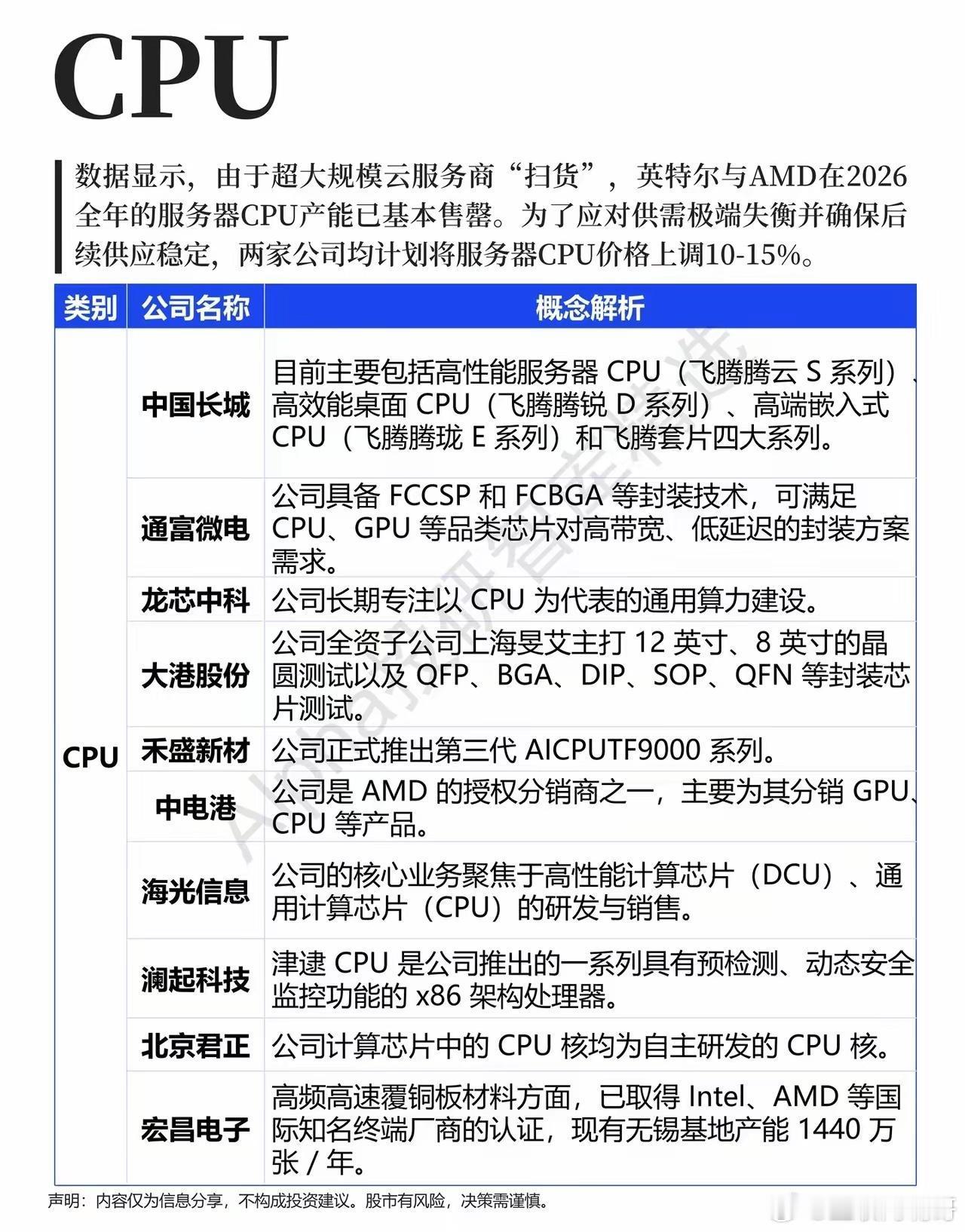 最近整个全球服务器CPU市场,正在迎来一场前所未有的供需大变局。行业数据显示,海外两大CPU巨头英特尔、AMD,2026年全年的服务器CPU产能,已经被云服务商提前全部“扫货买断”,产能直接售罄。面对极端紧缺的供需缺口,两家巨头已经官宣,计划将服务器CPU价格上调10%-15%。 海外大厂涨价、缺货的大背景下,国产自主CPU迎来了前所未有的替代窗口期,国内产业链相关企业迎来全新发展机遇。