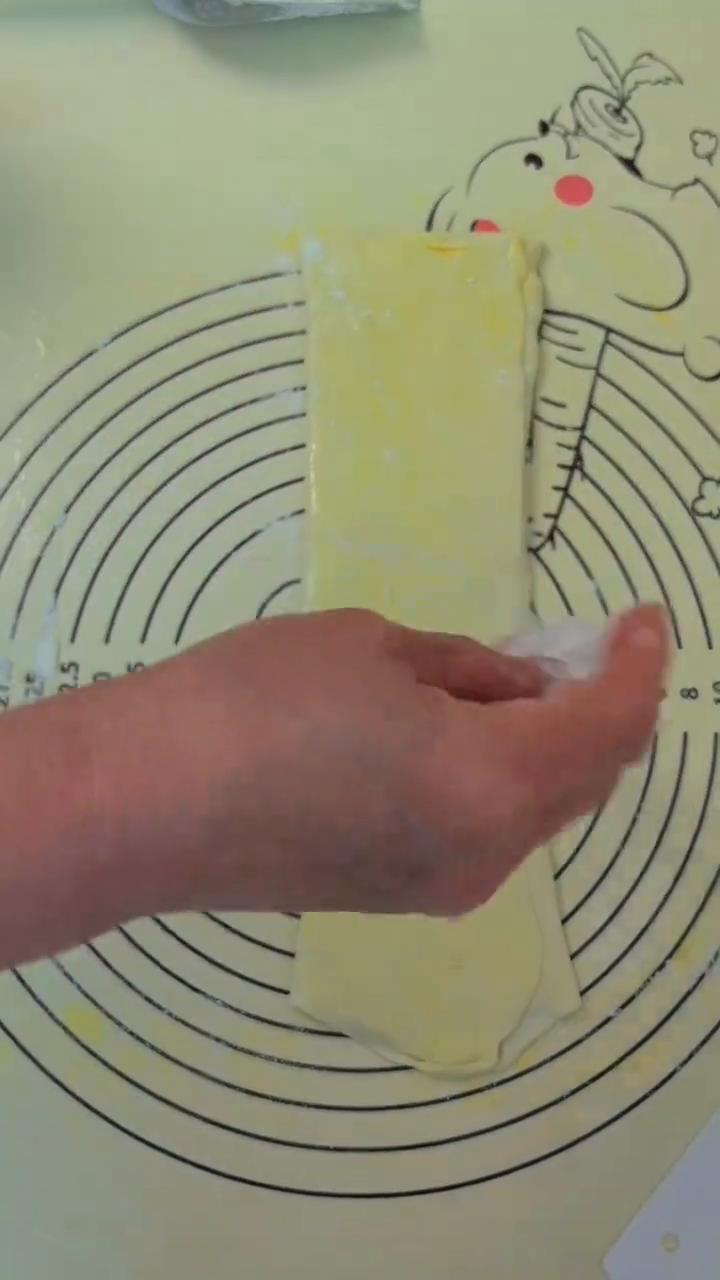 冷水烙大饼。 是不是都喜欢吃东北的大筋饼?不用烫面也不用发面,这柔软度冷水和面也柔软又多层,其实做法老简单了。你外孙早上上学时候说想吃东北大筋饼,咱整一个。这还不简单,一会就做好。 ·称出来半斤面粉就够,烙两张大饼就够咱吃的了。 ·150克的水,不加盐就用家里的常温水,一斤面6两水,好操作还不粘手。用冷水和面,面有筋性了就不用加盐了,揉成这样就行,不用光滑。 ·盖上保鲜膜,水和10分钟,轻轻的揉几下,你看还不粘手就光滑了。 ·平均把它分成两个剂子,把面剂子收圆,表面薄薄的喷层油,装袋儿里醒面30分钟。醒面不到位,烙出的饼就会硬。你看醒好的面延展性是非常好的。 ·摁开,一层油油抹匀以后,撒点干面粉也是帮助起层的。看手法了,折叠了再折叠,一个生坯就做好了。 ·盖上再让它松弛10分钟,松弛一下,你看很容易就擀开了。边上有泡的千万别擀破了,这是起层的关键。擀的薄一点,你看,擀的能看见底下的揉面垫。这个饼千万别烙时间长了鼓泡了起层了,这就是分层,熟了。 有没有喜欢吃东北大金饼的?