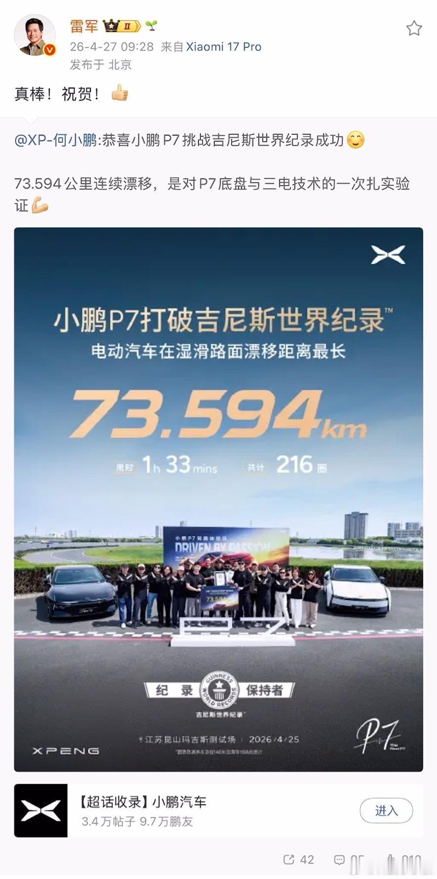 小鹏P7又创吉尼斯世界纪录纯电漂移纪录再次被刷新!小鹏P7成功挑战电动汽车湿滑路面最长漂移距离吉尼斯世界纪录,1小时33分钟连续漂移73.594公里,远超原有纪录。WRC冠军车手Andreas Mikkelsen亲自驾驶,持续高强度漂移依然稳定输出。这项突破不仅重新定义纯电性能,证明了小鹏P7优异的综合实力,还收获了雷军的点赞与祝贺。雷军祝贺小鹏P7破世界纪录