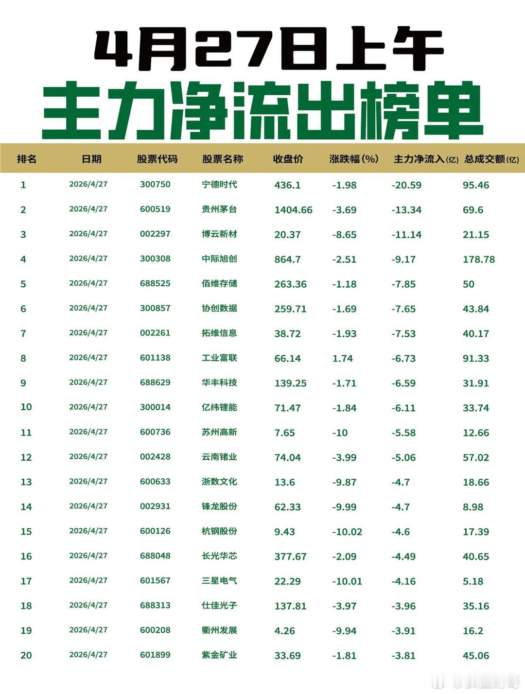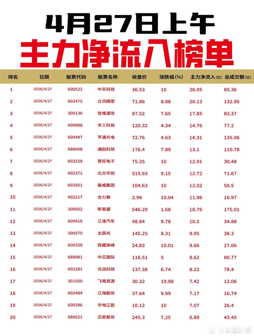 【4月27日上午主力净流入流出榜单出炉🔥】: 今日上午主力资金重点流入通信设备与消费电子板块。中天科技获26.05亿元净流入居首,立讯精密、信维通信、华工科技、亨通光电等获资金抢筹;澜起科技、景旺电子、北方华创等芯片及PCB股同步活跃。流出榜上,宁德时代遭20.59亿元抛售,贵州茅台、博云新材、中际旭创等资金流出居前。市场聚焦科技硬件方向,新能源及白酒板块承压。