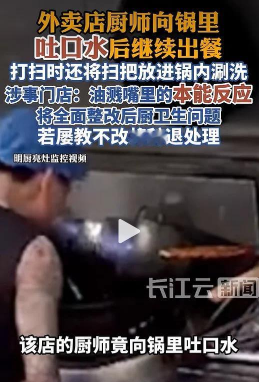 这都不开除,真牛×。 广东佛山。 厨师向锅里吐口水,再倒入食材,出餐。在打扫厨房时,把扫把放进炒菜锅涮洗,卫生状况令人堪忧。店长说,是他嘴里溅了油本能反应吐了一下,将对他进行处罚,如果屡教不改,直接辞退。 店长这是骗傻子呢?油的温度不低于130度,第一反应就是惊跳一下,这是神经系统的作用,不可能是吐口水。 这样的职业道德这样品德的人能当厨师?这不单是辞退的问题了,应该全行业封杀。 “如果屡教不改就辞退”,这饭店还想开门迎客吗?他还有机会再来一次吗?顾客早就不登门了,赶紧整改吧,太恶心了。
