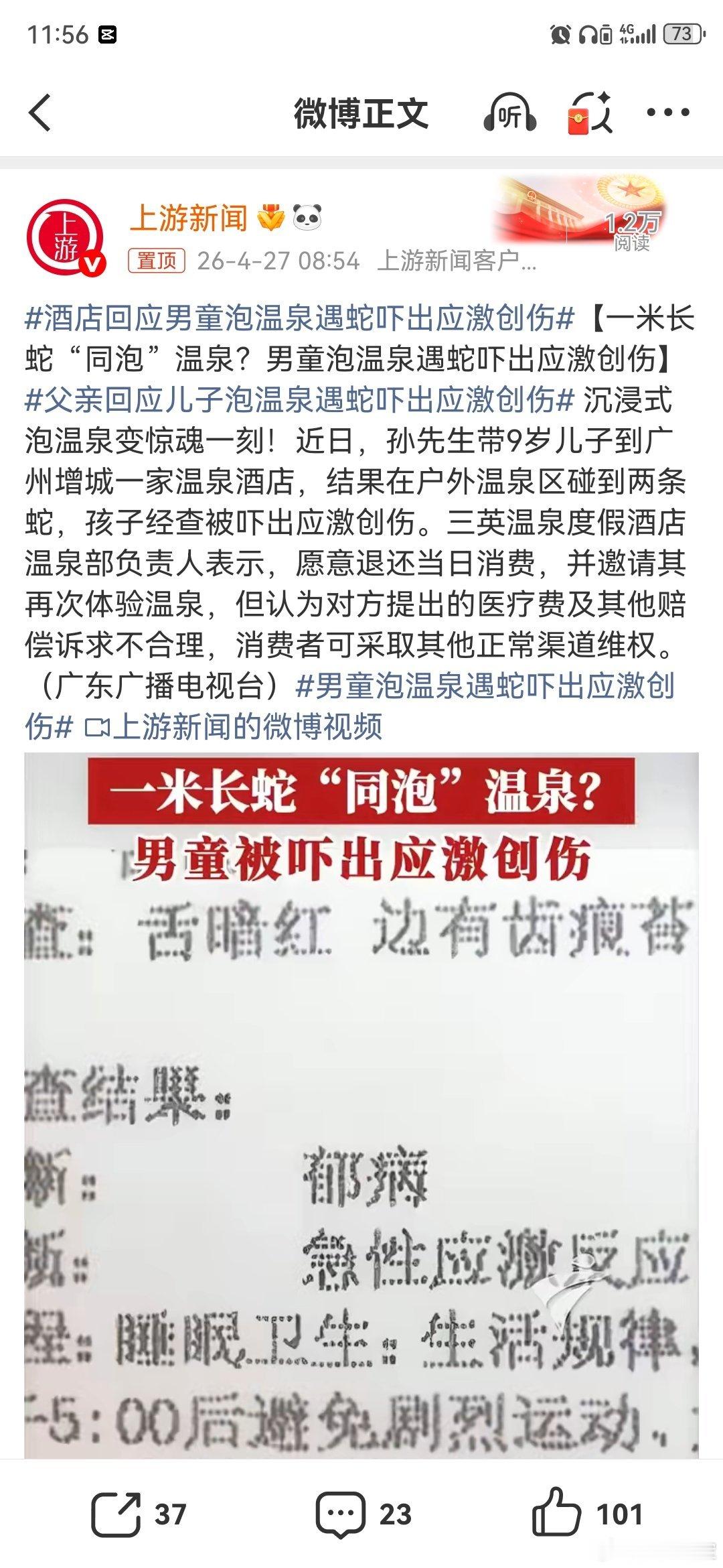父亲回应儿子泡温泉遇蛇吓出应激创伤酒店回应男童泡温泉遇蛇吓出应激创伤