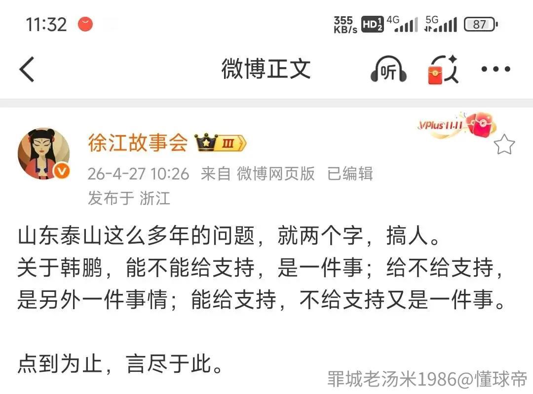 知名博主分析,山东泰山现在分四个派系! 董事长吴志东是体育局的人 总经理周培建济南文旅的人 俱乐部副总兼挂名主教练,负责引援的操盘手宿茂臻,是文旅找回来的人 实际上的主教练韩鹏是电力时期留下来的人。 而其实我们再分析教练团队: 唐田是崔康熙时期留下来的 34岁助教赵硕没踢过职业联赛,是做PPT高手。 外籍助教莫雷诺是海洋生物老师。 我们再分析球员: 10号瓦科不是组织中场,是边锋 19号泽卡不是中锋,是边锋 9号克雷桑不是中锋,是边锋 放眼整个中超球队,还有比山东泰山更业余的俱乐部吗?