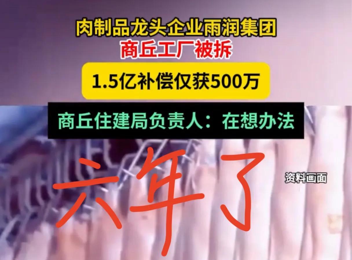 大公司被强拆了也是干瞪眼,雨润集团商丘工厂被强拆,1.5亿补偿款, 6年仅获得500万,找谁说理去? 那些强拆的人被绳之以法了吗?谁指使他们强拆的?违约强拆在先,违约拖欠补偿在后,企业受到的是双重伤害。 上了热搜是不是能尽快解决呢?