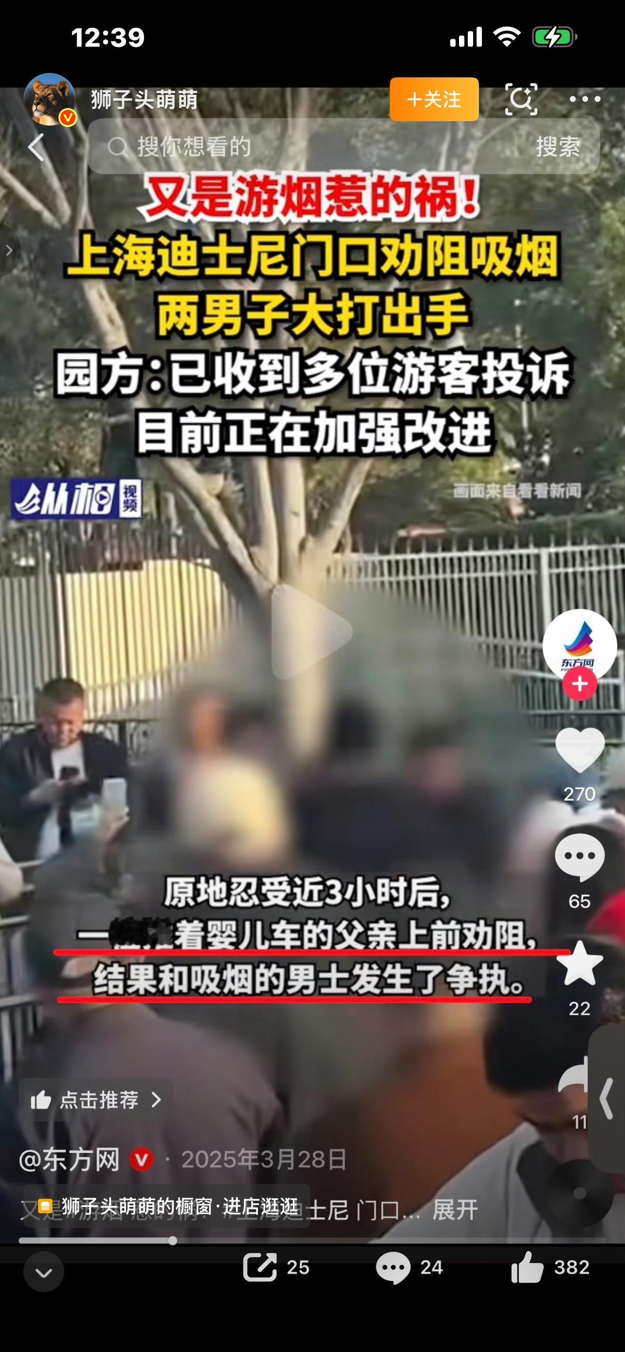 迪士尼抽烟乱象刷屏!童话世界吞云吐雾,规则底线在哪? 全网怒了!上海迪士尼被曝排队区、草坪、花车旁随处有人抽烟,二手烟直飘婴儿车,劝阻还被怼“小孩有多金贵”!童话滤镜碎一地,网友质问:花钱买罪受,这还是孩子的梦幻乐园吗? 很多人以为迪士尼是“全面禁烟”,觉得抽烟的人只是少数没素质,园方肯定管得很严! 可真相远比想象离谱: • 2023年:男子非吸烟区抽烟,工作人员劝阻反被骂哭,还躺平耍赖,最后被永久禁入园。 • 2025年3月:入园排队区多人抽烟,紧挨婴儿车,家长劝阻反遭怼,差点大打出手。 • 2025年5月:迪士尼高调宣布强化控烟,取消24个吸烟点,只剩11个指定区,贴满2800张禁烟标识。 • 2025年7月:游客仍扎堆吐槽,非吸烟区抽烟依旧泛滥,园区回应“在增派人手,有监管盲区”。 转折点就在这:不是没规则,是有人无视规则;不是没管理,是管理管不住没素质的人! 明明有指定吸烟区,偏要在人群密集处抽;明明工作人员好言劝阻,偏要蛮横无理耍脾气。把个人烟瘾,凌驾在几千人的健康之上,这不是“自由”,是自私! 这事真不是小题大做! 迪士尼主打“亲子童话”,最多的就是老人、小孩、孕妇,二手烟危害多大,不用多说。排队区人挤人,抽烟不仅熏人,烟头还容易烫伤孩子,安全隐患巨大。 园方其实一直在努力:减少吸烟点、贴满标识、发提示卡、劝阻违规者,甚至违规严重直接禁入园。但架不住少数人“我行我素”,觉得“室外抽烟没人管”“我花钱了想在哪抽就在哪抽”。 更寒心的是,每次出事,都是工作人员受委屈、其他游客受影响,违规者却理直气壮。 迪士尼的童话,从来不是靠城堡和烟花,而是靠文明、秩序和互相尊重。 我们不反对吸烟,但请守住底线:尊重规则、尊重他人、远离孩子。别让一时烟瘾,毁了别人的快乐,也别让不文明行为,玷污了童话世界的美好。 希望园方拿出更硬的管理,也希望每个人都能多一份自觉:文明游园,才是对童话最好的守护。 你在迪士尼遇到过抽烟乱象吗?评论区聊聊你的经历!上海乐园迪士尼 迪士尼消费陷阱 上海迪士尼实测 上海迪士尼探店 上海迪士尼投诉 迪士尼冲突 迪士尼旅游打卡