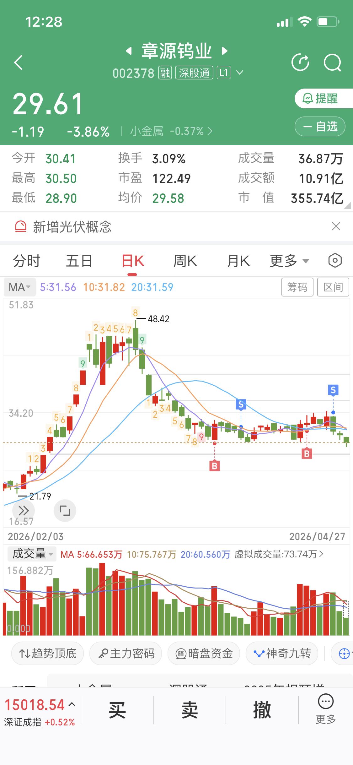 幸亏我把章源钨业上周割了 不然又要损失4、5个点 跌破我的止损位立即割 玩A股就是割的艺术 死扛越套越深 看不到头 股票是好股票但是主力要出货了 一根大阴线改变了股票趋势 从横盘震荡开始走下行通道了 什么时候止跌企稳 成交量连续放大再考虑上车吧