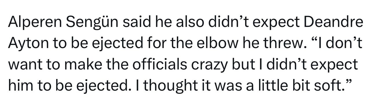 申京表示,他也没想到艾顿因为那次肘击被驱逐出场:“我不想让裁判抓狂,但我真没想到他会被罚出去。我觉得那下有点软(不至于被驱逐)。”火箭1比3湖人