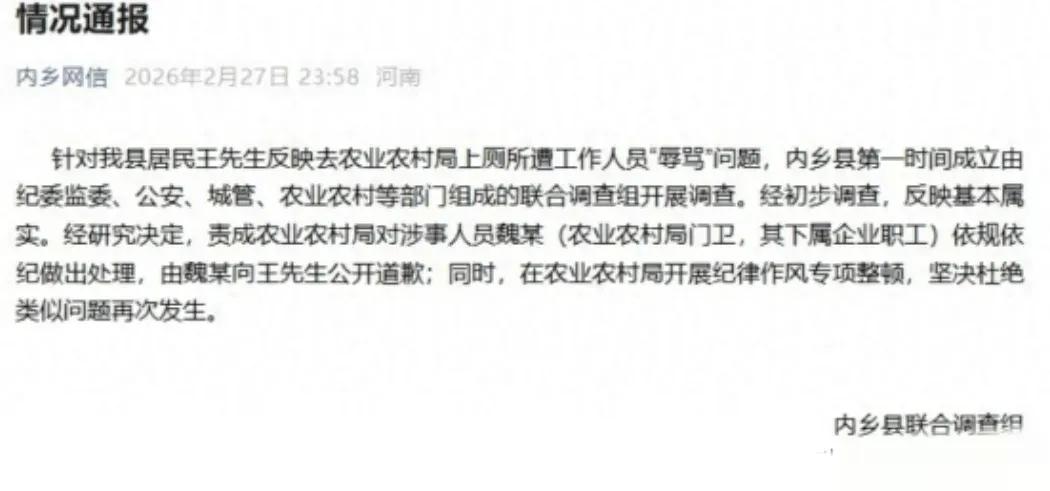 一泡尿引出多个政府介入调查?2026年2月,河南一大哥尿急就想进农业农村局解决一下,大哥为了快点找到厕所,就问了一下门口的门卫,就是一个举手之劳的事,却遭到门卫的辱骂。 河南南阳内乡县的李大哥在县城逛街时,突然感到内急,周边走访一圈都没找到公共厕所,正当他手足无措时,发现路边有一块绿色指示牌,清晰标注着“机关单位公厕对外开放”,箭头直指旁边的内乡县农业农村局。 说真的,换谁都会这么做!你想啊,人有三急,这是最基本的生理需求。李大哥今年42岁,是内乡县湍东镇的普通农民,那天是进城给儿子买开学用品,本来挺高兴的一件事,谁能想到会遇到这种糟心事。他看到指示牌时,心里还挺暖,觉得现在政府办事越来越人性化了,可接下来的遭遇,直接浇了他一盆冷水。 李大哥走到门卫室,客客气气地问:“师傅,麻烦问一下,你们单位的厕所怎么走?”他说这话时,还特意笑了笑,想着多客气点总没错。可谁知道,门卫头都没抬,冷冷地来了一句:“你眼睛瞎了吗?不会自己找!”李大哥当时就愣住了,他以为自己听错了,又问了一遍,结果门卫更火了,站起来指着他的鼻子说:“我还把你当神敬嘞!你今儿是闲着没事了是吧?”这些话,像针一样扎在李大哥心上。 你可能不知道,内乡县早在2021年就推出了“共享厕所”政策,20个临街单位免费向群众开放内部卫生间,农业农村局就是其中之一。南阳市2024年的城市市容和环境卫生管理条例也明确鼓励临街单位内部厕所在工作时间内免费对外开放 。这块绿色指示牌,就是政府为了方便群众特意设置的,可到了门卫这里,怎么就成了摆设? 李大哥当时气得浑身发抖,他掏出手机,对着门卫说:“你这是什么态度?政府明明规定厕所对外开放,你凭什么骂人?”门卫见状,更是不依不饶,嘴里骂骂咧咧,还想动手抢他的手机。幸好有路过的市民看到,赶紧上前拉住了门卫,劝了几句,李大哥这才得以脱身,去旁边的商场解决了问题。 换作别人,可能忍忍就过去了,但李大哥偏不。他觉得这不是小事,这是政府的便民政策被“念歪了经”。当天下午,他就拨打了南阳市12345政务服务热线,把事情的来龙去脉说了一遍,要求相关部门给个说法 。他说:“我不是为了自己出气,我是为了所有老百姓,不能让政府的好心政策,被个别工作人员的坏态度给毁了!” 没想到,这通电话真的起了作用。内乡县第一时间成立了由纪委监委、公安、城管、农业农村等部门组成的联合调查组,专门调查这件事 。调查组调取了门卫室的监控,询问了当时在场的人员,很快就查清了事实。2月27日,也就是事发后的第13天,内乡县联合调查组发布了情况通报,称反映基本属实,涉事人员魏某(农业农村局门卫,其下属企业职工)被依规依纪处理,还得向李大哥公开道歉;同时,农业农村局还要开展纪律作风专项整顿,杜绝类似问题再次发生 。 你以为这就结束了?并没有!这件事在网上传开后,引发了网友的热烈讨论。有人说:“这就是典型的‘小鬼难缠’,门卫的态度,反映的是整个单位的作风问题。”还有人说:“政府的政策再好,落实不到位,也是白搭。”甚至有网友挖出了内乡县之前的“共享厕所”宣传文章,对比之下,更是让人觉得讽刺。 其实,李大哥的遭遇不是个例。在很多地方,都存在政策“看得见、摸不着”的情况。政府出台了很多便民措施,可到了基层,要么被打折扣,要么被曲解,最后受伤的还是老百姓。就像内乡县的“共享厕所”,本来是为了方便群众,结果却因为一个门卫的恶劣态度,让政府的形象打了折扣。 说句心里话,机关单位对外开放厕所,不是什么难事,也花不了多少钱,却能体现城市的温度和政府的服务意识。南阳市2018年就要求中心城区所有沿街机关、企事业单位一楼公厕免费对外开放,原则上保证每日8:00—20:00时全面开放 。这些政策的出台,都是为了让老百姓的生活更方便,可为什么到了执行层面,就这么难呢? 李大哥最后接受了魏某的道歉,他说:“我不是想让谁丢工作,我就是想让大家都能重视这件事,以后别再让其他人遇到这种情况。”他的要求很简单,却道出了很多人的心声。政府的权力是人民赋予的,政府工作人员的职责就是为人民服务,而不是摆架子、耍威风。 这件事也给所有机关单位敲响了警钟。便民政策不能只停留在文件上、指示牌上,更要落实在行动上。一个小小的厕所,看似是件小事,却能反映出一个地方的治理水平和服务意识。希望内乡县的这次整顿,能真正起到作用,让“共享厕所”不再是“作秀的牌子”,而是实实在在方便老百姓的“民心工程”。 各位读者,你们怎么看?欢迎在评论区讨论。
