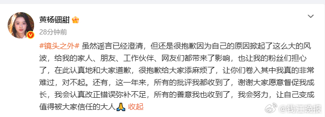 #黄杨钿甜为耳环风波道歉#【#黄杨钿甜首次回应耳环风波#】刚刚,发微博回应耳环风波:虽然谣言已经澄清,但还是很抱歉因为自己的原因掀起了这么大的风波,给我的家人、朋友、工作伙伴、网友们都带来了影响,也让我的粉丝们担心了,在此认真地和大家道歉,很抱歉给大家添麻烦了,让你们卷入其中我真的非常难过,对不起。还有,这一年来,所有的批评我都收到了,谢谢大家愿意督促我成长,我会认真改正错误弥补不足,所有的善意我也收到了,我会努力,让自己变成值得被大家信任的大人。(新浪娱乐)