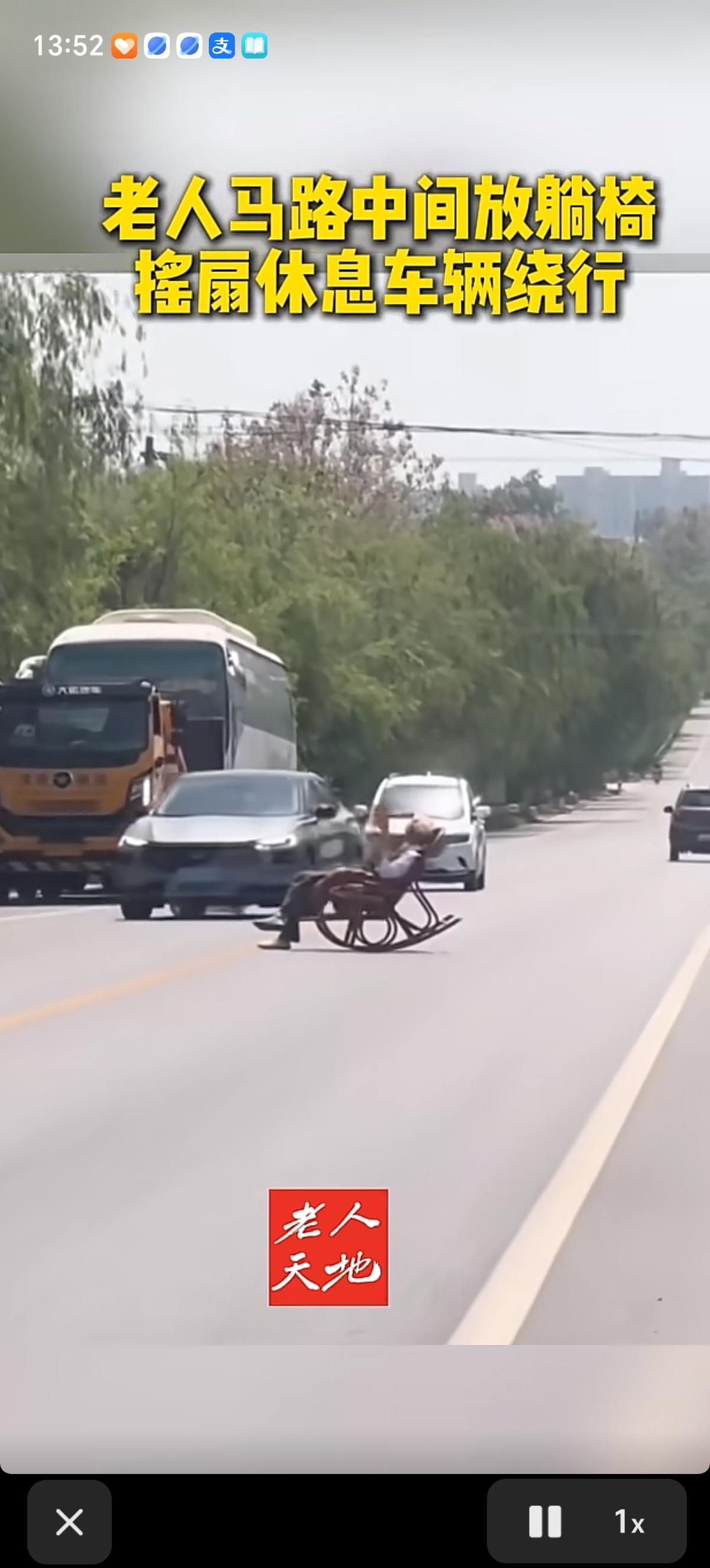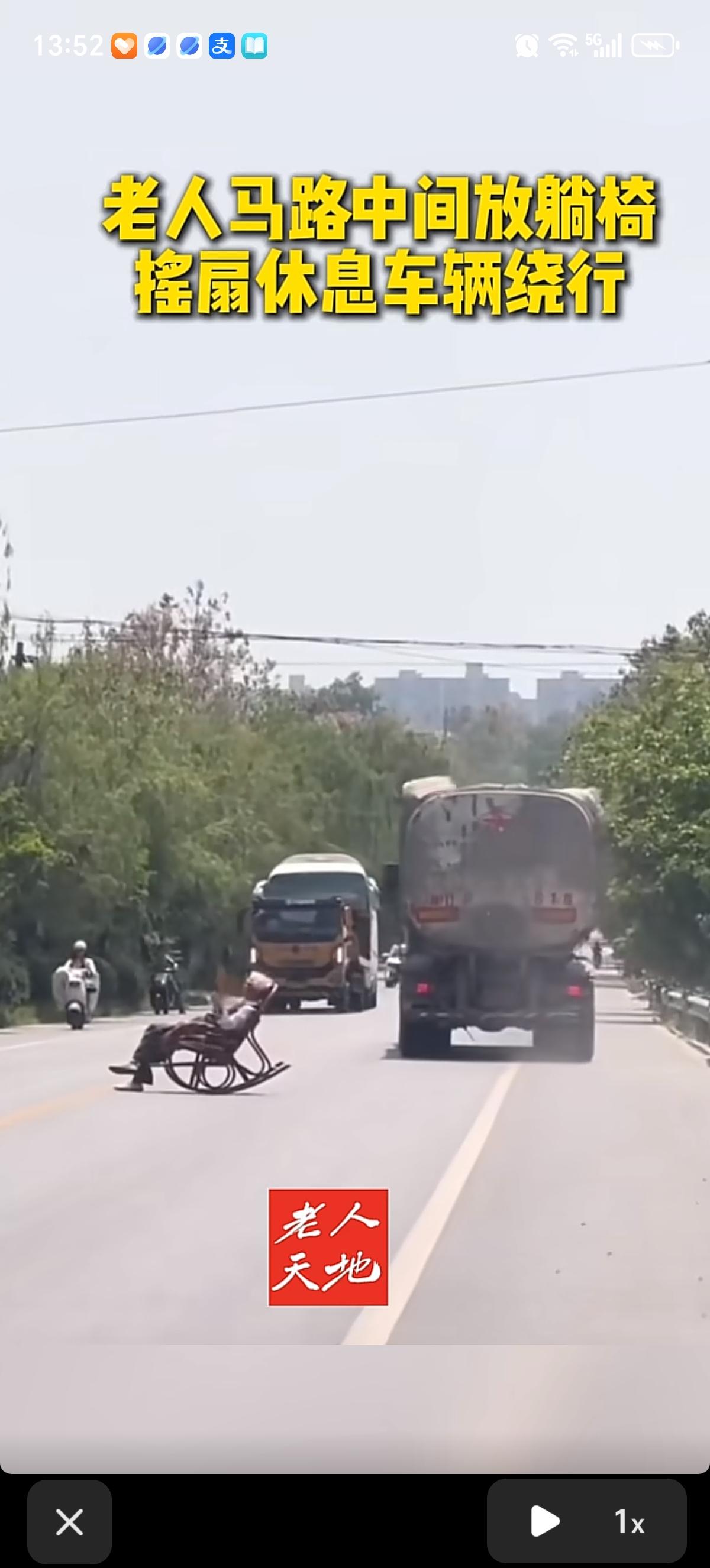 有个大爷直接把躺椅搬到了马路中间,就坐在黄线上摇着扇子休息,跟在自家院子里一样自在。 路上车来车往的,大货车、小车都只能减速绕着他走,看得人手心冒汗。司机们都捏着一把汗,生怕有个闪失。网友都骂他拿命开玩笑,还有人怀疑是故意摆拍博眼球。 这事儿真的太危险了,马路中间车多视线差,大车司机有盲区,真撞上了谁都担不起。 素材来自青报老年生活报