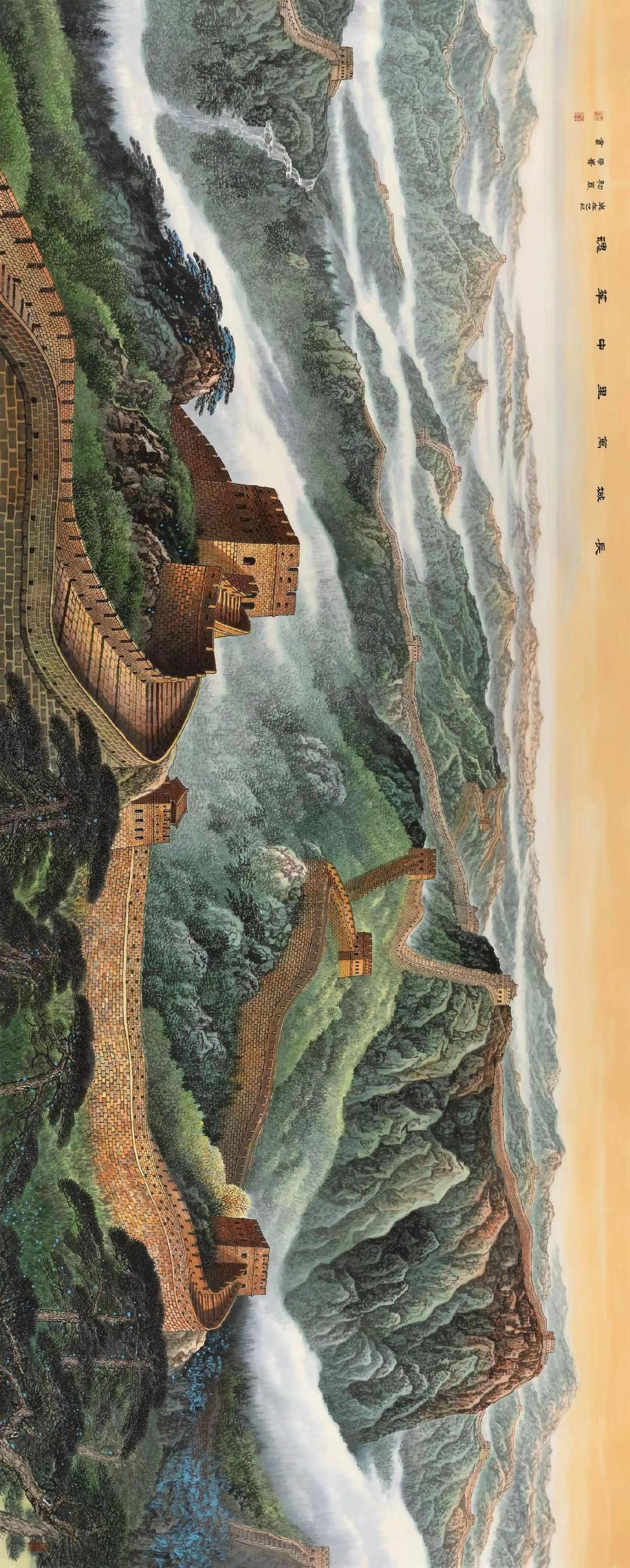 万里长城中华魂。长城山水创作者中心 创作灵感 国画山水 手绘长城 水墨画 尺寸:367cm x 144cm