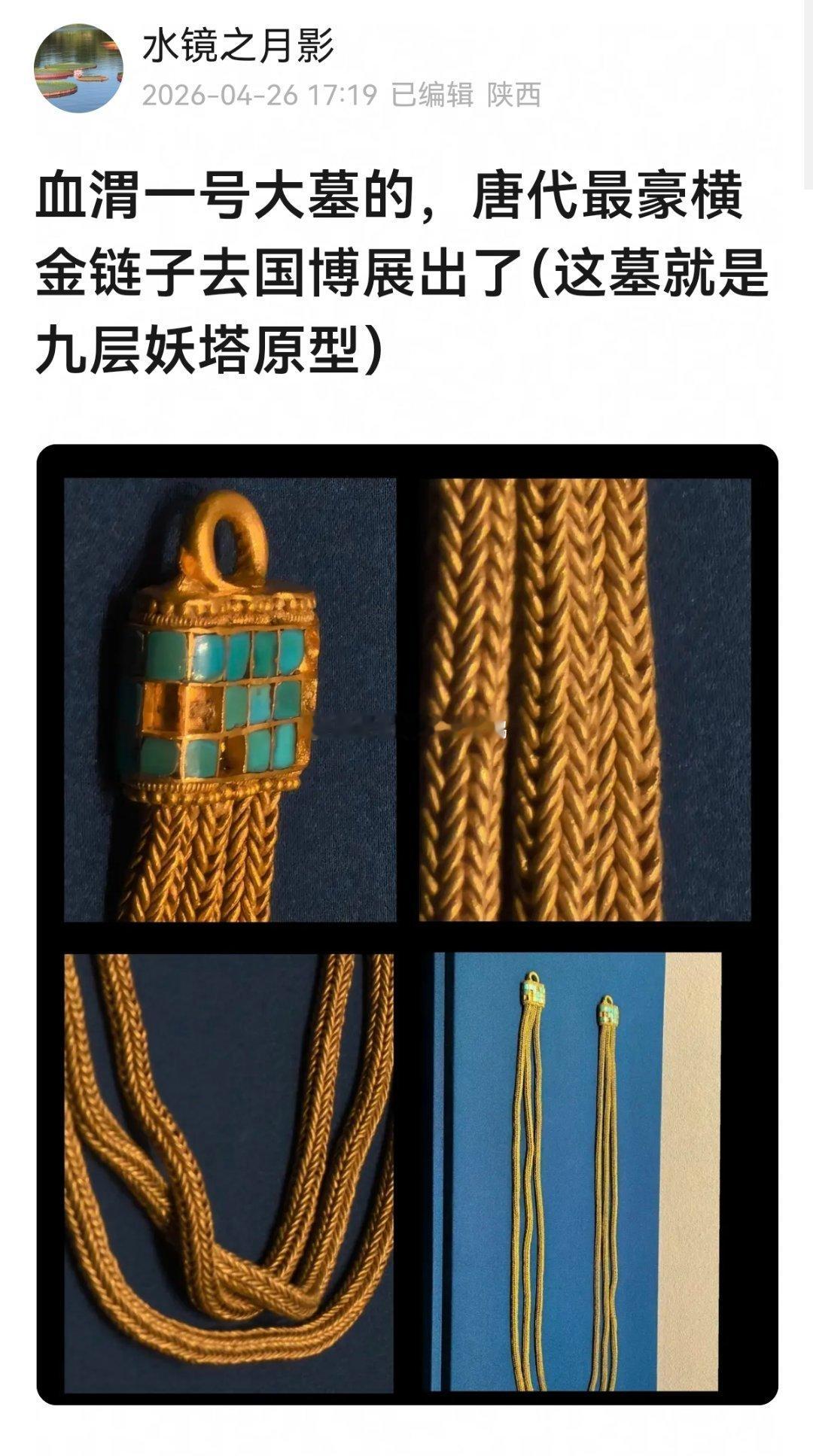血渭一号大墓的,唐代最豪横金链子去国博展出了(这墓就是九层妖塔原型),太豪横了,