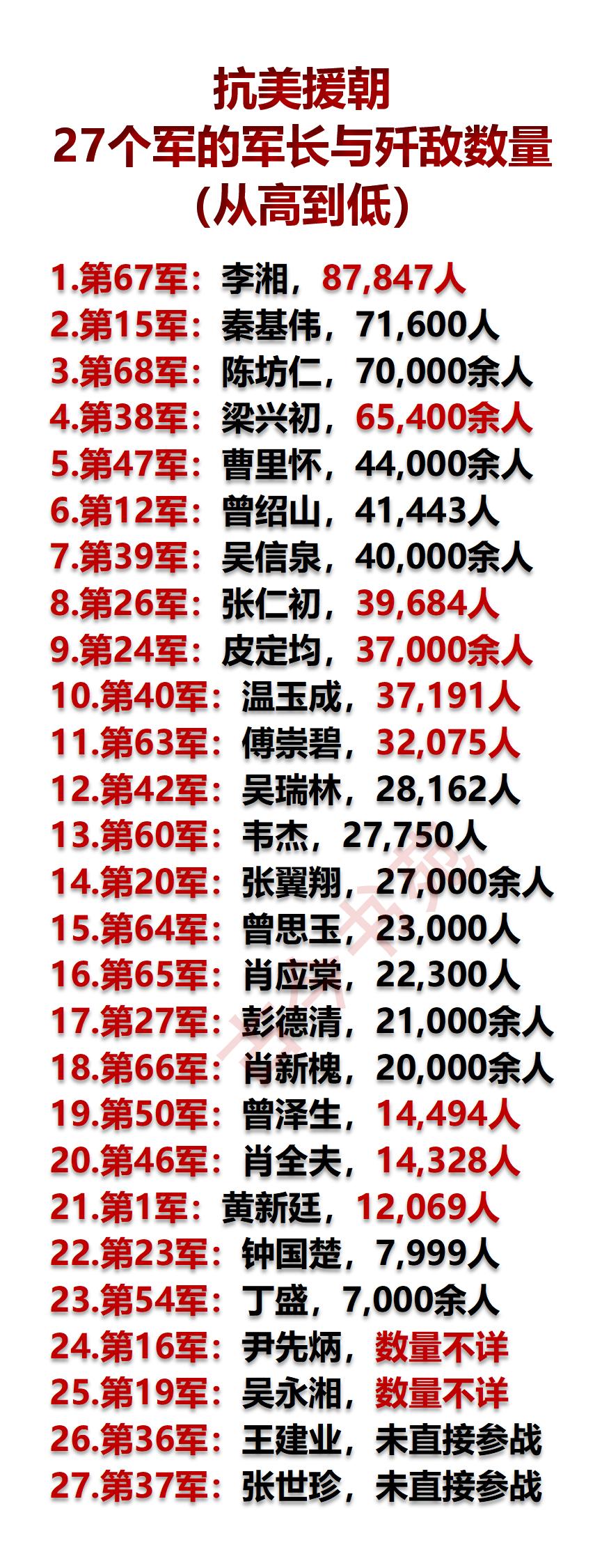 抗美援朝,27个军的军长和歼敌数量一览! 唇亡齿寒[灵光一闪] 1950年10月19日,有这么一支部队,跨过鸭绿江,开赴朝鲜战场,因为属于帮扶作战,不是维护自家领土,要想能在国际上占稳理。 再三思考后,以自愿性质的加入。因此,这支部队的名字被定义成“中国人民志愿军”。 进入朝鲜以后,我们不叫中国人民解放军,我们是志愿军,不是中国的正规军。 军队性质的变化,在国际明面上也好看了一些。 抗美援朝这一战,我国先后投入27个军,每个军的军长和歼敌数量,已整理在一张图片上。