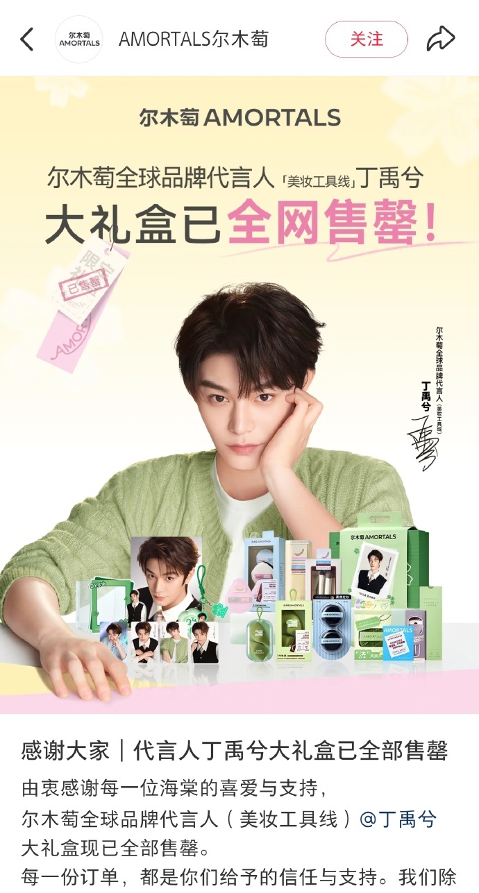 丁禹兮今天官宣尔木萄全球品牌代言人,开售即售罄🐮