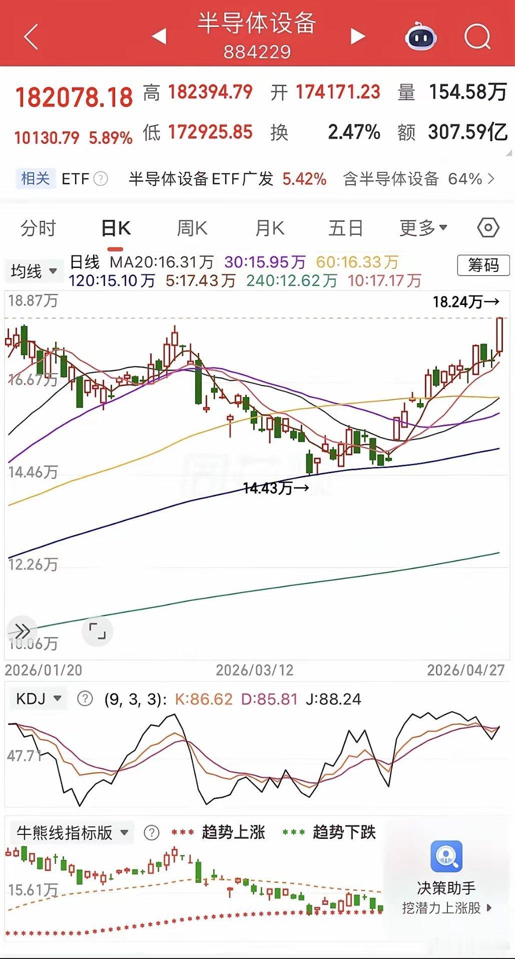 半导体大涨,节前震荡为主1、指数。微红,小幅震荡,在预期内,上方有套牢筹码,小阴小阳都是逼空和洗盘。暂时还不具备大行情,在4200没有突破之前,上面套牢筹码需要清洗,保持耐心,但是月线看涨。五月中下旬机会比较大。2、证券。跌破20日均线后,支撑位在前低附近,可以低吸,但是暂时还没大行情。3、科技。Ai上游主线明确,cpo切换到了半导体,半导体设备更是大涨6%,接棒cpo上涨,其他只能喝喝汤了,普涨估计要等下个月了,目前资金不够只支持个别板块上涨。财经有想法的评论区留言一起交流。
