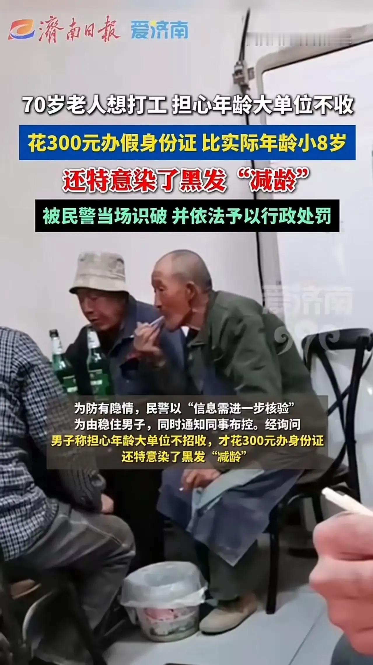 70岁老人为了打工赚钱,竟然花300元办假身份证,还特意染黑头发“装嫩”,结果被民警当场识破,这究竟是怎么回事? 这位老人已经70岁高龄,本该是在家安享晚年的年纪,却为了生计不得不外出打工。他担心年龄太大找不到工作,于是想出了办假身份证的主意,把年龄改小了8岁,还特意染了黑发来“减龄”。然而,他的这一行为很快就被民警识破,并依法受到了行政处罚。这事传到网上后,引发了网友们的热议。很多人表示,看到老人这样真的让人感到心酸。他可能并不是不懂法,只是在生存面前,违法的后果显得不那么重要了。更让人扎心的是,有网友评论说:“他年轻的时候交公粮、出义务工,养活了一辈人,怎么到老了却要靠造假证才能找活干?”这句话道出了多少人的无奈和心酸。 这位老人的遭遇让人深感同情,也让我们反思社会现实。希望相关部门能给予这些老人更多的关注和帮助,让他们能够安享晚年。大家对此有何看法呢?欢迎在评论区留言讨论!伪造身份证罪 伪造身份证