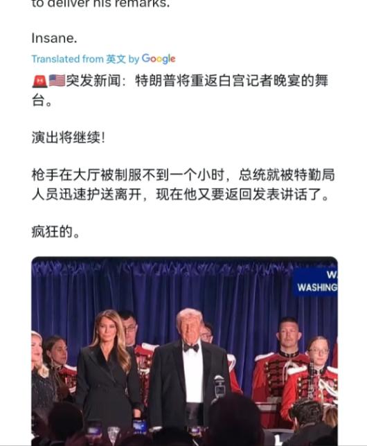 不得不说,特朗普是真爷们!在枪手刚被击毙之后,特朗普在白宫记者晚宴上重返舞台,并做出宣布,演出会继续!外媒表示,不到一个小时,一名枪手在大厅中被制服,特朗普决定重新安排宴会,并回去发表他的讲话。 按理说,刚发生枪击事件,现场人心惶惶、惊魂未定,绝大多数政客都会选择紧急终止活动、立刻离场避险,优先保障自身安全。绝不会冒险重回混乱未消的现场,但是特朗普反其道而行之,短暂休整之后,就返回舞台。 从枪手冲卡开枪、现场大乱,到特警迅速处置、彻底制服嫌疑人,前后不过短短一小时。在所有人还没从恐惧中缓过神,现场安保还在全面排查隐患、宾客依旧人心惶惶的时候,特朗普做出了一个让全网热议、外媒争相报道的决定:重新安排晚宴,原定演讲照常进行。 要知道,这是特朗普时隔11年再度出席白宫记者晚宴,也是他此次任职期间首次参加这场顶级媒体盛会,本身就备受全美舆论关注。 枪击突发意外,给他提供了一个完美的退场理由,顺势取消活动、提前离场,完全不会有人诟病,反而能收获一波安全避险的正面评价,毫无风险、稳赚不赔。 但他偏不这么做。短暂休整、确认现场局势可控后,他毅然折返舞台,稳住全场局面,坚持完成既定流程。这种行事风格,放在惜命又圆滑的美国政坛里,简直是独一份的存在。 美国政坛常年充斥着精致的利己主义者,大多数政客遇事第一时间想的是规避风险、保全自己、维护人设,很少有人愿意在余波未平的危险现场,主动扛起稳住场面的责任。 外媒对此也是感慨万千,纷纷评价特朗普的魄力远超一众同行。在枪击惊魂事件的加持下,此刻的舞台早已不是简单的演讲场地,而是充满未知风险的现场。 没人能百分百保证,彻底制服一名枪手后,会不会还有同伙、会不会出现二次危险。可特朗普不在乎这些潜在风险,他看重的是活动的完整性、现场的秩序,以及关键时刻的担当。 特朗普向来是这种天不怕地不怕的硬核性格。 此前他就多次遭遇刺杀威胁,竞选集会、私人庄园都曾出现过持枪袭击风险,但他从来没有因此畏缩避事。面对危险,他很少选择退缩妥协,反而越是突发危机,越能稳住心态、从容应对。 整场事件看下来,不得不佩服特朗普的心态和格局。在人人自危、全员避险的混乱时刻,他顶住未知风险、顶住舆论压力,选择稳住全场、完成演讲。 这份临危不乱的定力,这份逆势而行的勇气,放在当下的美国政坛,确实无人能及,也难怪无数网友看完后感慨一句:特朗普,是真的硬气。 权威信源: 俄罗斯卫星通讯社——《华盛顿记协晚宴因枪击事件陷入混乱》 新华网——《特朗普称白宫记协晚宴将重新安排》