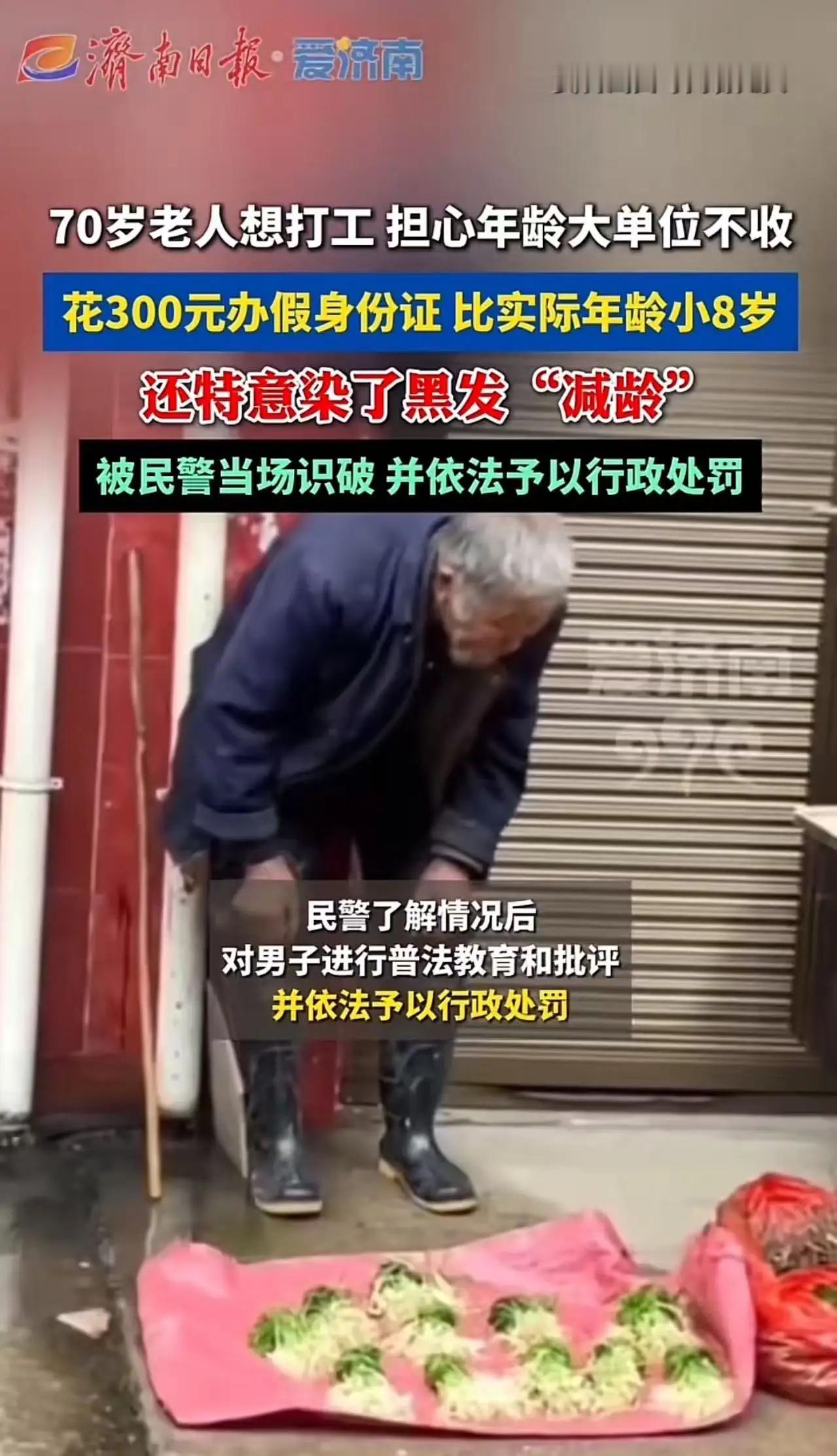 70岁染黑发办假证:人生下半场,健康才是最后的体面 诸位朋友,今儿咱们,单说一桩发生在派出所里的“心酸闹剧”。这事儿,听着像“天方夜谭”,实则是一记敲在无数“打工人”心坎上的警钟。江苏一位70岁的大爷,本该是含饴弄孙的年纪,却为了生计,花300元办了张“减龄”8岁的假身份证,还特意把满头白发染得乌黑锃亮。谁曾想,这“返老还童”的戏法还没演完,就被民警一眼识破。大爷那一刻的窘迫,比那黄连还苦三分。 想当年,咱们总觉得“老骥伏枥,志在千里”,谁曾想现实往往是“廉颇老矣,尚能饭否”的无奈。大爷为何要铤而走险?无非是生活所迫,养老金微薄,不想成为儿女的负担,想靠自己的双手挣口饭吃。可这岁月的痕迹,岂是一瓶染发剂能遮盖的?这哪是“求职”?分明是“与天斗”的悲壮,让人看了心里五味杂陈,既心疼又唏嘘。 但这“心酸”的背后,藏着的正是咱们今天要说的“大健康”真谛。真正的健康,讲究“身心双调”。外在,咱们得学会“未雨绸缪”,别让那“老无所依”成了晚年的“噩梦”,年轻时多存点“健康本”,老了才能从容不迫;内在,这“感恩之心”更是不可或缺。我们要感恩这“身体的馈赠”,是它默默承载着我们几十年的风雨兼程;更要感恩这“当下的安稳”,它让我们明白,人生本就是一场借假修真的旅程,只有身心安顿,灵魂才能自由。这种“知足常乐”的通透,才是滋养生命的“灵丹妙药”。 我们要感恩这“岁月的洗礼”,它虽带走了青春,却让我们学会了珍惜眼前的每一份拥有。 愿世间少一些“老无所依”的悲凉,多一些“老有所养”的安详。 愿你我皆安康,前程皆似锦! 假证查真身份