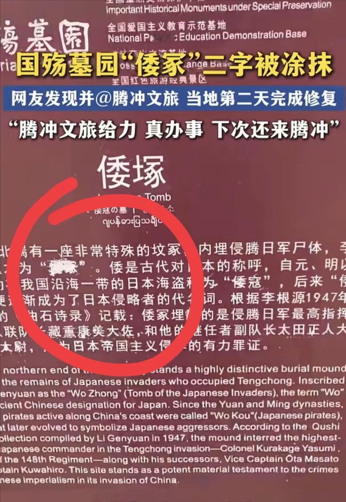 4月23日,云南腾冲国殇墓园出事了!一名游客发现"倭塚"石碑上,"倭"字被人用涂料恶意涂抹!字迹模糊不清。游客当场拍照,发到网上@腾冲文旅,照片迅速传开,登上热搜。 腾冲文旅也很快做出了回应与保护工作,4月24日,腾冲文旅部门组织专业人员携带工具赶到现场,清理、填补、复原,将"倭塚"二字恢复原样,笔画清晰,颜色如初。 4月23日,云南腾冲国殇墓园,一块石碑被人抹了一脸涂料。 不是涂鸦,不是恶作剧。刻的是“倭塚”两个字,那个“倭”字被糊得只剩几个残破的笔画,像是被谁狠狠扇了一巴掌。 发现这事的是四川来的陈先生,一个历史爱好者。他祭扫完山上的远征军英烈,顺着墓园小径从坡上走下,行至最下方时,目光不经意掠过一方墓碑,瞬间察觉出异样。原先清晰可辨的碑文字迹,如今却变得模糊残破,模样十分不堪。 他没敢碰。掏出手机,从各个角度拍了一堆照片和视频,当场上传,@了腾冲文旅和文物保护部门。 配文里他写了一句:这可不是普通的石碑,这是日本侵华战争的铁证,是无数先烈用血肉换来的历史见证! 帖子发出去没几个小时,转发量就炸了。评论区一片骂声,“数典忘祖”“无法无天”这类词刷了屏。网友们的诉求很一致:查!必须查!给全国人民一个交代! 腾冲文旅的反应够快。当天晚上就启动了调查程序,和墓园管理方连夜碰头,敲定了修复方案。 第二天一早,专业人员带着工具进场。清理、打磨、补色,全程录像留档。忙活到中午,那两个字总算恢复如初,笔画清晰有力,颜色也补得天衣无缝。当天下午相关部门便发布通告,表明已就此事向警方报案,案件正在依法调查处理中。 字是补回来了,但问题没消失。 谁干的?到底想干什么? 想要弄明白这件事的来龙去脉,需要将时光回溯到八十年前的那段岁月。 1944年,中国远征军第二十集团军仰攻高黎贡山、血战腾冲城,整整127天,9000多人把命丢在了那片山沟里。自抗日战争全面爆发后,中国军队首次将日军驻守县城的部队尽数歼灭,并且完好收复了这座被敌军占据的县城。 仗打完了,8000多具日军尸体怎么处理?扔掉怕引发瘟疫,好好安葬当地百姓不答应。 当时的云贵监察使李根源当即决定,将日军第 148 联队长藏重康美等几名军官双手反绑,让他们对着烈士陵墓跪地安葬,以示惩戒。他在这座墓葬前立下石碑,亲自挥毫题写了两个大字,刻于碑上便是 “倭塚”。 “倭”是中国古代对日本的蔑称,“塚”就是坟。这两个字翻译过来就是:侵略者的下场。 整座墓园顺着山势修建布局,山顶位置矗立着阵亡将士纪念塔,山脚下便是那座倭塚墓葬。一高一低,一褒一贬。烈士在山坡上安息,侵略者在洼地里跪着。 后来又在旁边铸了四座日军跪姿雕像,面朝满山的墓碑,八十多年了,姿势从来没变过。 这么多年里,日方一直对此事耿耿于怀,多次试图从中作梗、进行干预。他们曾通过外交途径提出抗议,声称这样的安葬形式,侵犯了逝者的人格尊严。更有日方商人公开扬言,只要当地拆除这座倭塚,十亿元规模的投资便可立刻落实。 腾冲这边的回应一直很硬:拆?可以。先把靖国神社拆了,再把教科书里篡改历史的内容改干净,最后以日本政府的名义公开道歉。 三个条件摆在桌面上,这么多年过去了,日本一条都没办到。 雕像还在跪,碑文还在立。腾冲人用最直白的坚守向世人宣告,曾经的血泪与屈辱,并非漫长时光就能轻易抹去。 更重要的是,1996年国殇墓园就被列入了全国重点文物保护单位。它不单是一段刻在百姓心中的往事,更是被法律明确保护、不可随意改动的历史文物遗存。 腾冲文旅报警不是走过场。《刑法》第324条故意损毁文物罪,伺候着。涂掉的是两个汉字,触碰的是国家文物保护底线和民族历史尊严。 说回那个涂字的人。不管是无知到不知道倭塚意味着什么,还是知道却故意这么干,这事都踩了所有人的底线。 去年有个朋友从腾冲回来,跟我说他站在小团坡上往下看,满山墓碑密密麻麻,很多上面连名字都没刻,只写着四个字——无名烈士。 他说站那儿胸口堵得慌。那些兵好多才十几岁,按现在的说法还是孩子,可他们永远留在了1944年的秋天。 沿着坡地下行转过拐角,倭塚孤寂地坐落于墓园底端,始终对着山上英烈墓碑,保持着长跪的姿态。 他那一刻心里想的不是仇恨,而是觉得:今天能在这儿站着、能说走就走去看这个世界,是因为山顶上那些人替他挡过。 所以,被涂掉的两个字隔天就被重新描上了漆,这事根本不稀奇。 那碑立在墓园最低处,每天都能看清满山坡的墓碑。跪了八十多年了,总有人不乐意、有人不舒服。 可它就得一直这么跪下去。 那两个字的命运,其实早就注定了。 信息来源:云南日报 2026-04-2314:10 近日,网友发现腾冲“倭冢”字样被涂抹,当地反应迅速,第二天就原样修复。历史不容涂改,真相必须守护。