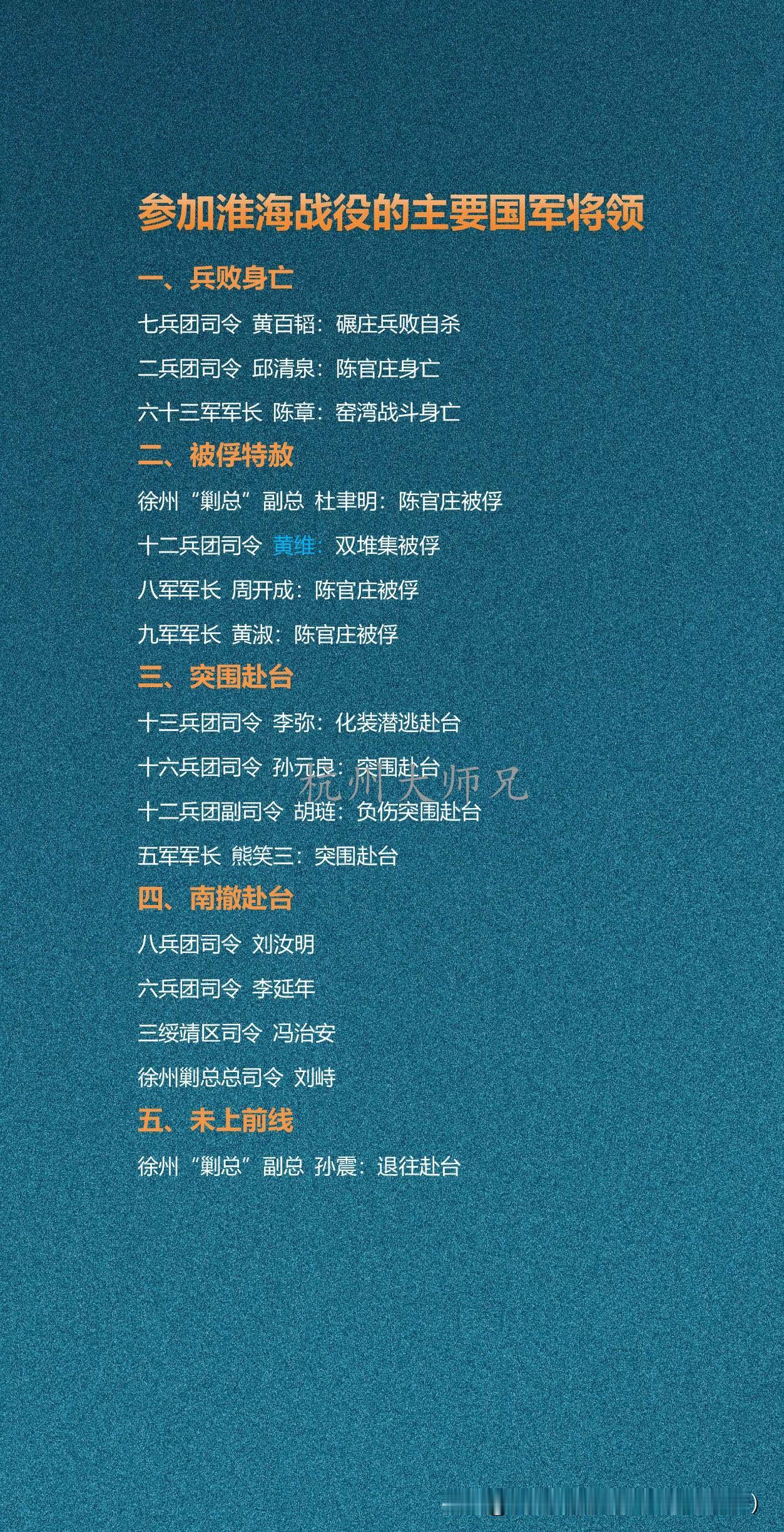 参加淮海战役的主要国军将领 淮海战役中,国民党军主要将领结局各异。黄百韬、邱清泉、陈章兵败身亡;杜聿明、黄维、周开成、黄淑被俘后获特赦;李弥、孙元良、胡琏、熊笑三突围逃台;刘汝明、李延年、冯治安、刘峙南撤赴台;孙震未及参战即退往台湾。
