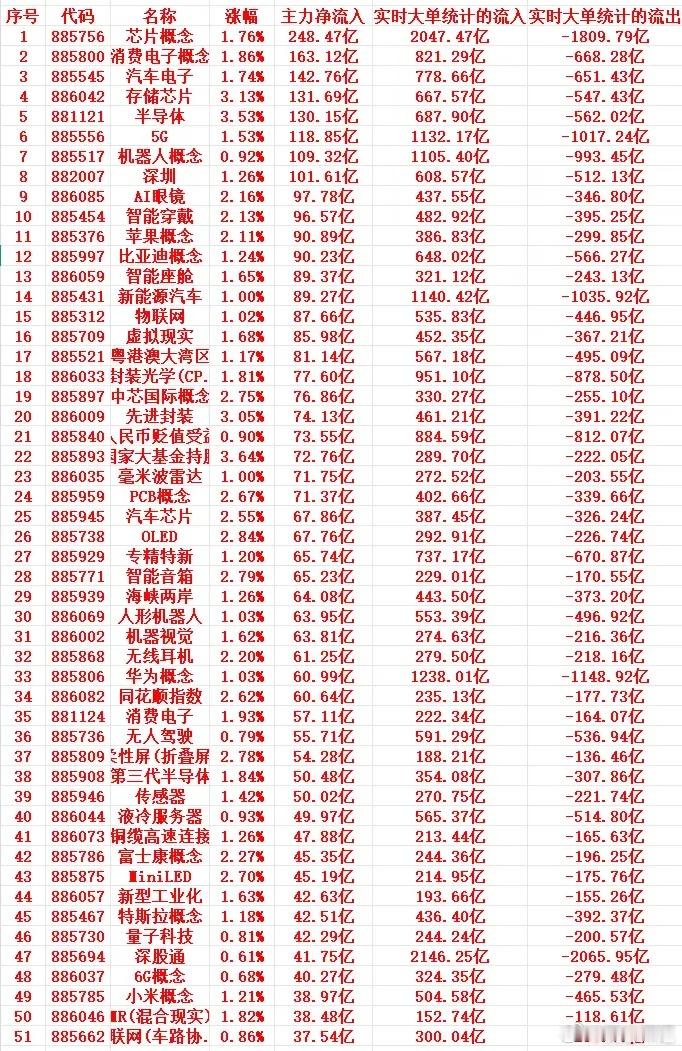 序号 代码 名称 涨幅 主力净流入 实时大单统计的流入 实时大单统计的流出1 885756 芯片概念 1.76% 248.47亿 2047.47亿 -1809.79亿2 885800 消费电子概念 1.86% 163.12亿 821.29亿 -668.28亿3 885545 汽车电子 1.74% 142.76亿 778.66亿 -651.43亿4 886042 存储芯片 3.13% 131.69亿 667.57亿 -547.43亿5 881121 半导体 3.53% 130.15亿 687.90亿 -562.02亿6 885556 5G 1.53% 118.85亿 1132.17亿 -1017.24亿7 885517 机器人概念 0.92% 109.32亿 1105.40亿 -993.45亿8 882007 深圳 1.26% 101.61亿 608.57亿 -512.13亿9 886085 AI眼镜 2.16% 97.78亿 437.55亿 -346.80亿10 885454 智能穿戴 2.13% 96.57亿 482.92亿 -395.25亿11 885376 苹果概念 2.11% 90.89亿 386.83亿 -299.85亿12 885997 比亚迪概念 1.24% 90.23亿 648.02亿 -566.27亿13 886059 智能座舱 1.65% 89.37亿 321.12亿 -243.13亿14 885431 新能源汽车 1.00% 89.27亿 1140.42亿 -1035.92亿15 885312 物联网 1.02% 87.66亿 535.83亿 -446.95亿
