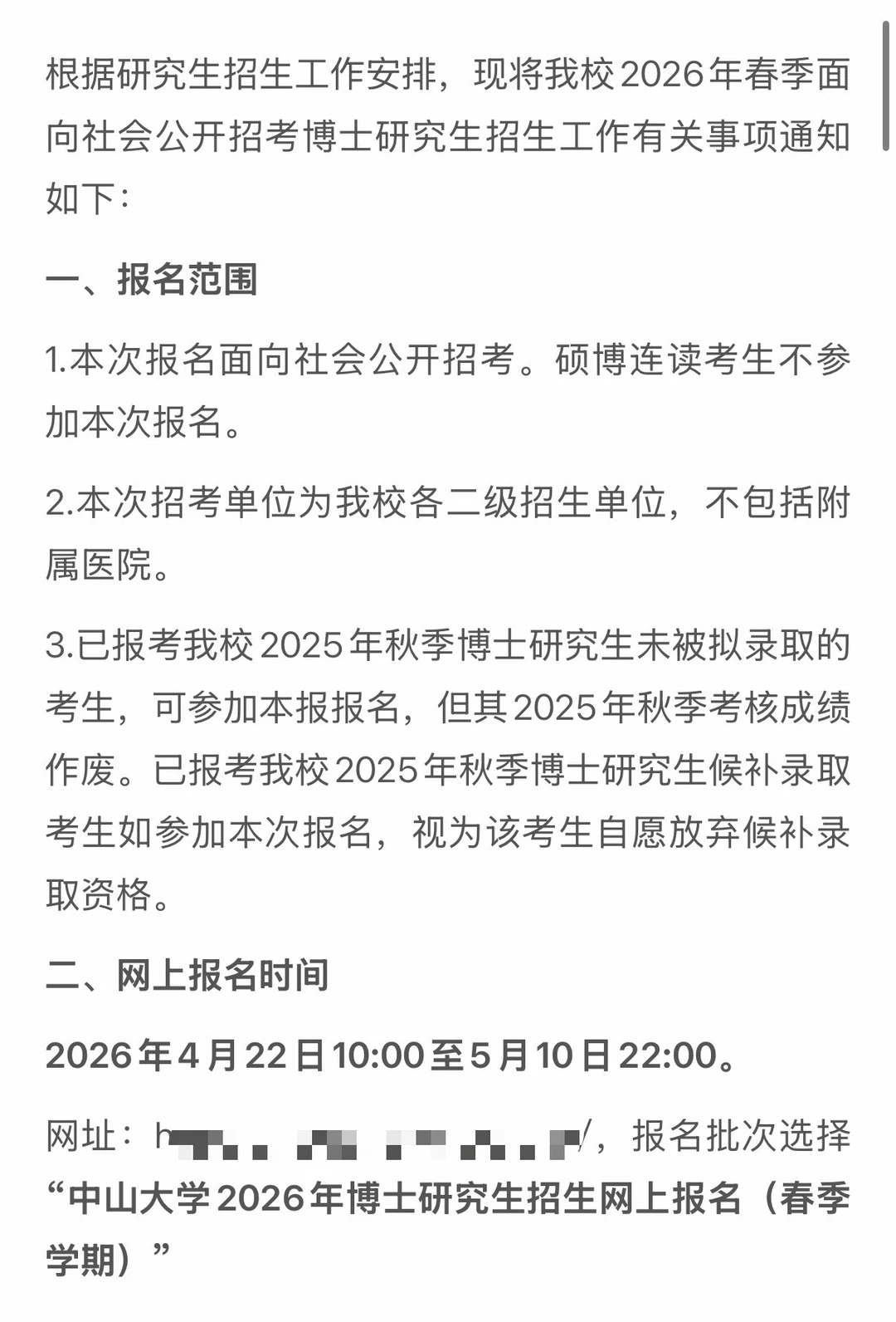 一、报名范围 1.本次报名面向社会公开招考。硕博连读考生不参加本次报名。 2.本次招考单位为我校各二级招生单位,不包括附属医院。 3.已报考我校2025年秋季博士研究生未被拟录取的考生,可参加本报报名,但其2025年秋季考核成绩作废。已报考我校2025年秋季博士研究生候补录取考生如参加本次报名,视为该考生自愿放弃候补录取资格。 二、网上报名时间 2026年4月22日10:00至5月10日22:00。