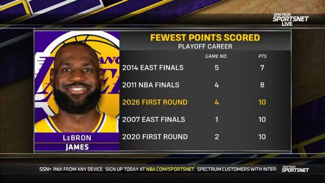 10分是詹姆斯季后赛生涯第三低分,此前曾有过7分和8分。分别在2014年东决G5和2011年总决赛G4。火箭1比3湖人