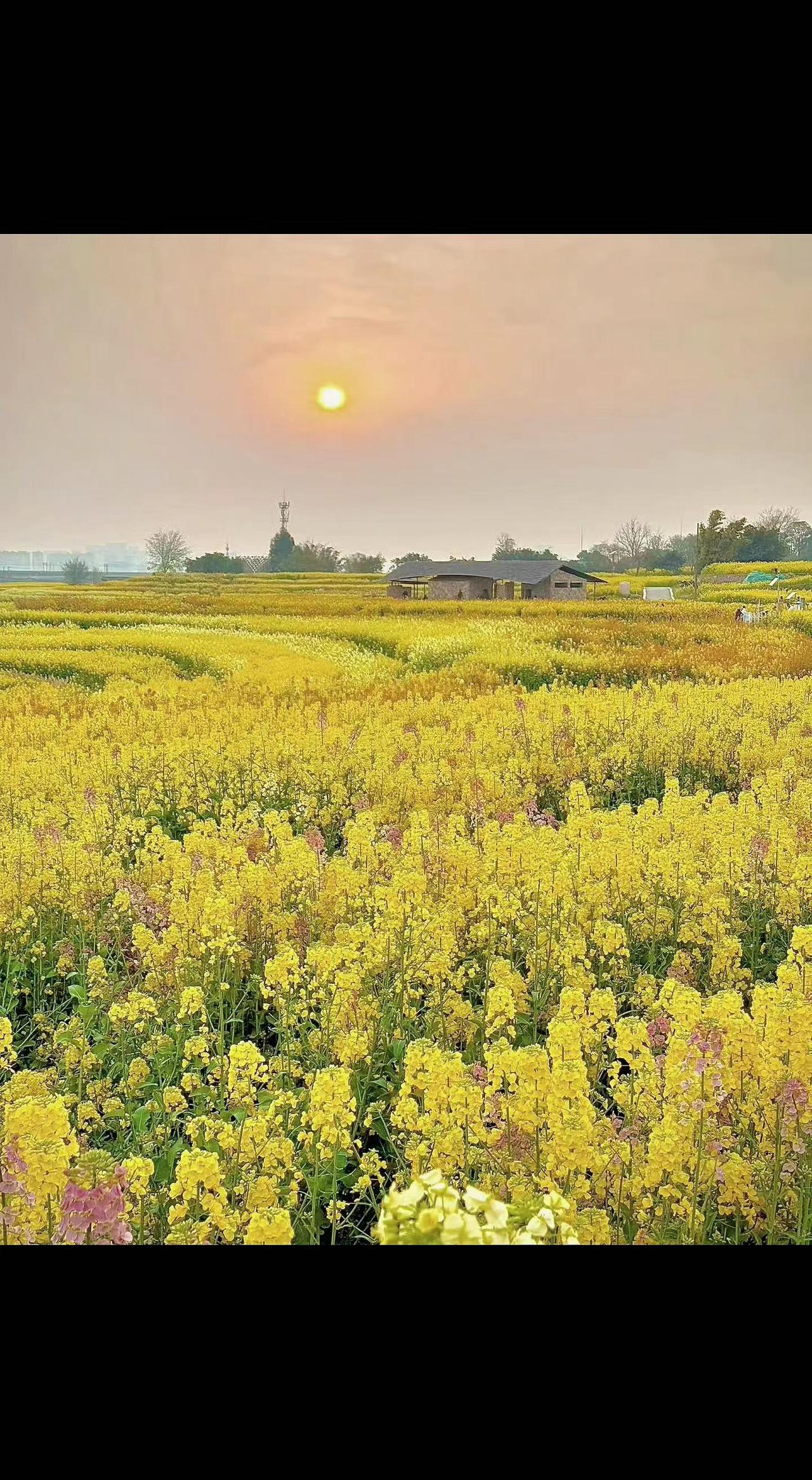 🌾夕阳把花海染成蜜罐🍯,风过时涌起金色海浪🌊。那间小屋藏着春天的所有秘密✨