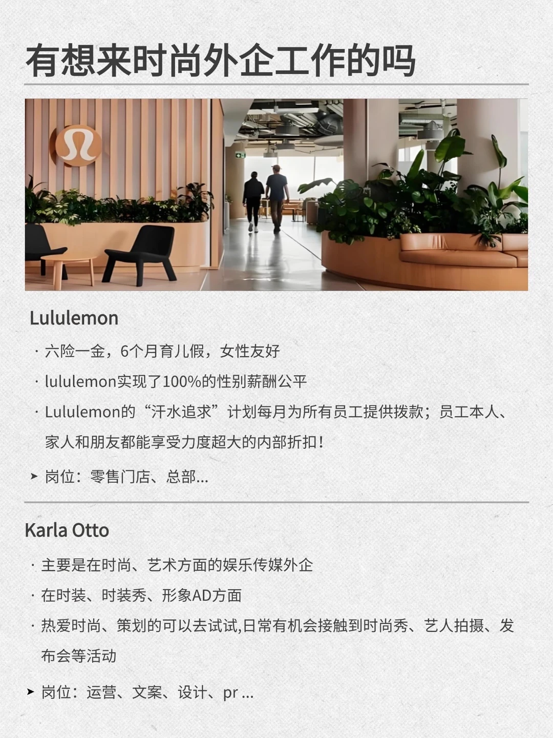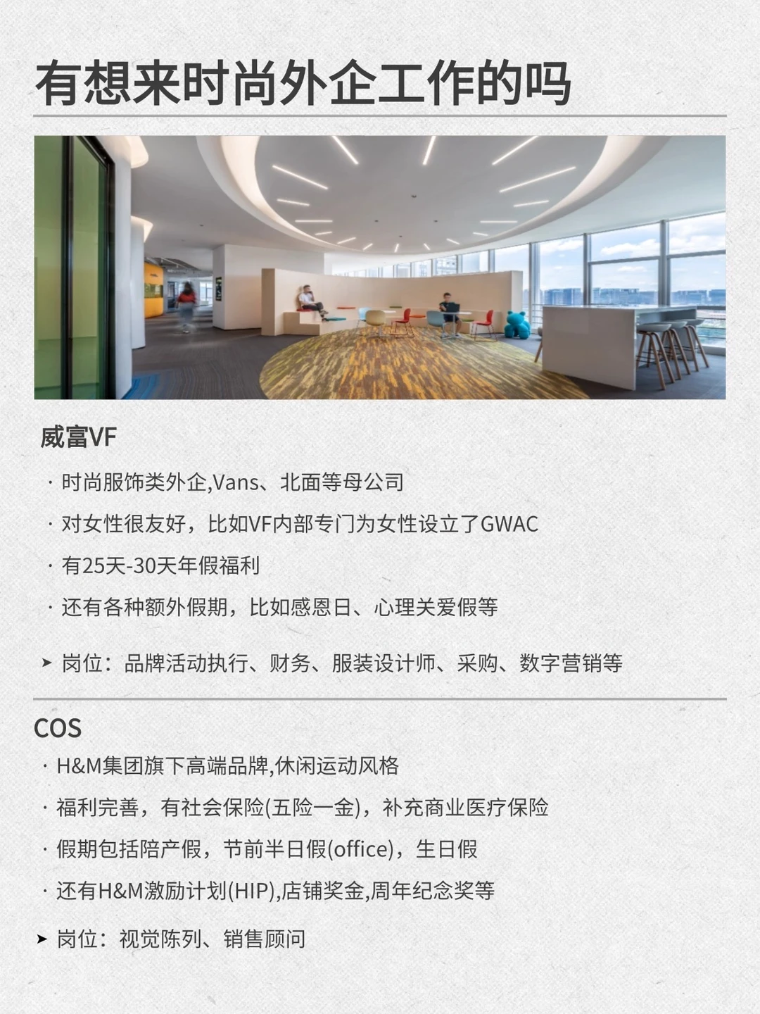 如果本身对服装、品牌、审美这些东西有兴趣, 时尚外企其实是一个挺合适的方向 这几年像 clean fit、长期主义这些趋势也越来越火,很多品牌发展都挺不错的 · 为什么可以试试时尚外企? ▪️办公和门店都很精致,日常氛围更舒服 ▪️团队更偏创意和表达,沟通也更直接 ▪️门店、市场、电商、运营、设计、职能岗都有机会 ▪️年假基本 10–15 天,还有员工折扣、弹性办公这些 · 坚持日更,帮大家在找工作路上顺利拿 offer! ·