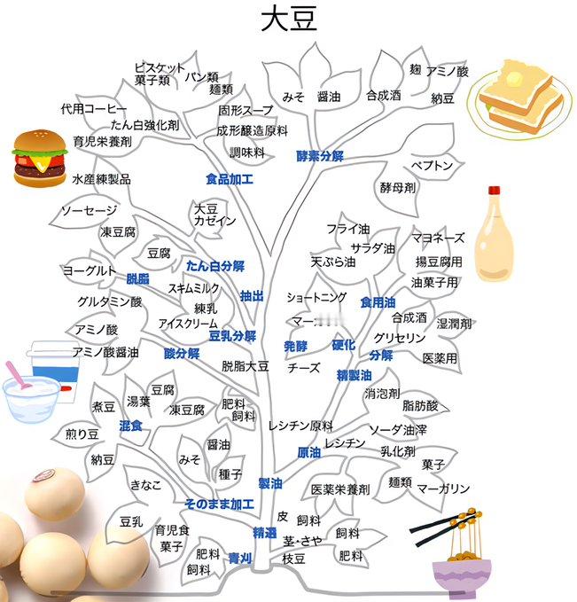 从大豆中提取的卵磷脂被用作乳化剂,而氨基酸则被用作化学调味料等产品的原料。正如这样,转基因作物经过加工,被用作各种加工食品的原料。然而,由于日本的标签制度尚不完善,消费者无从查证,导致人们在不知情的情况下食用了这些产品,这便是现状。