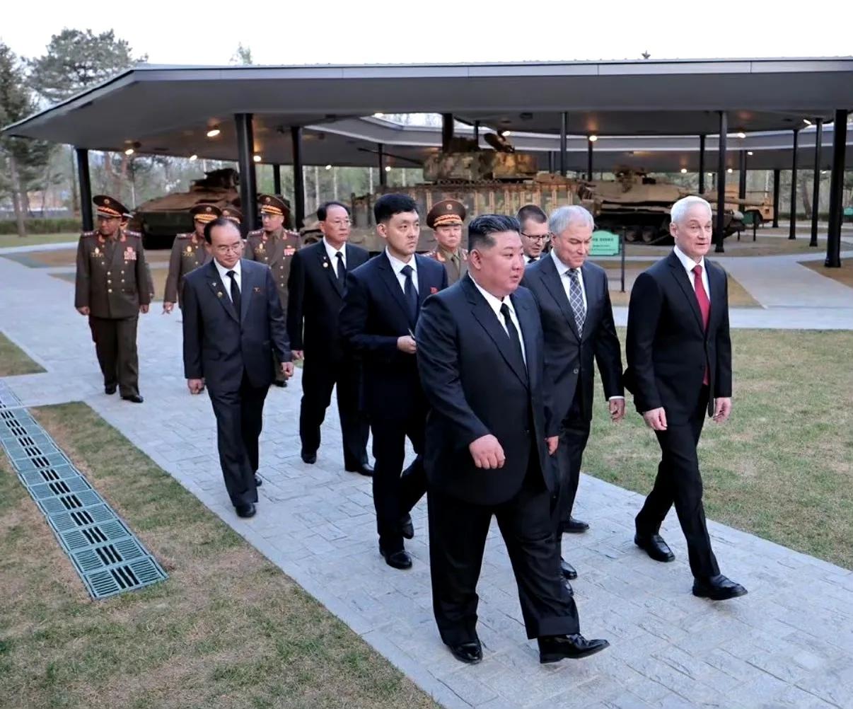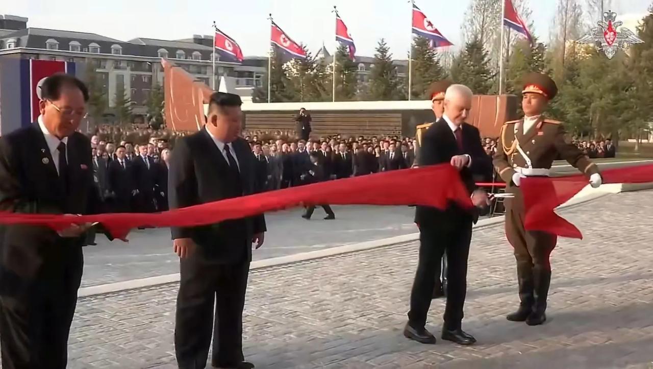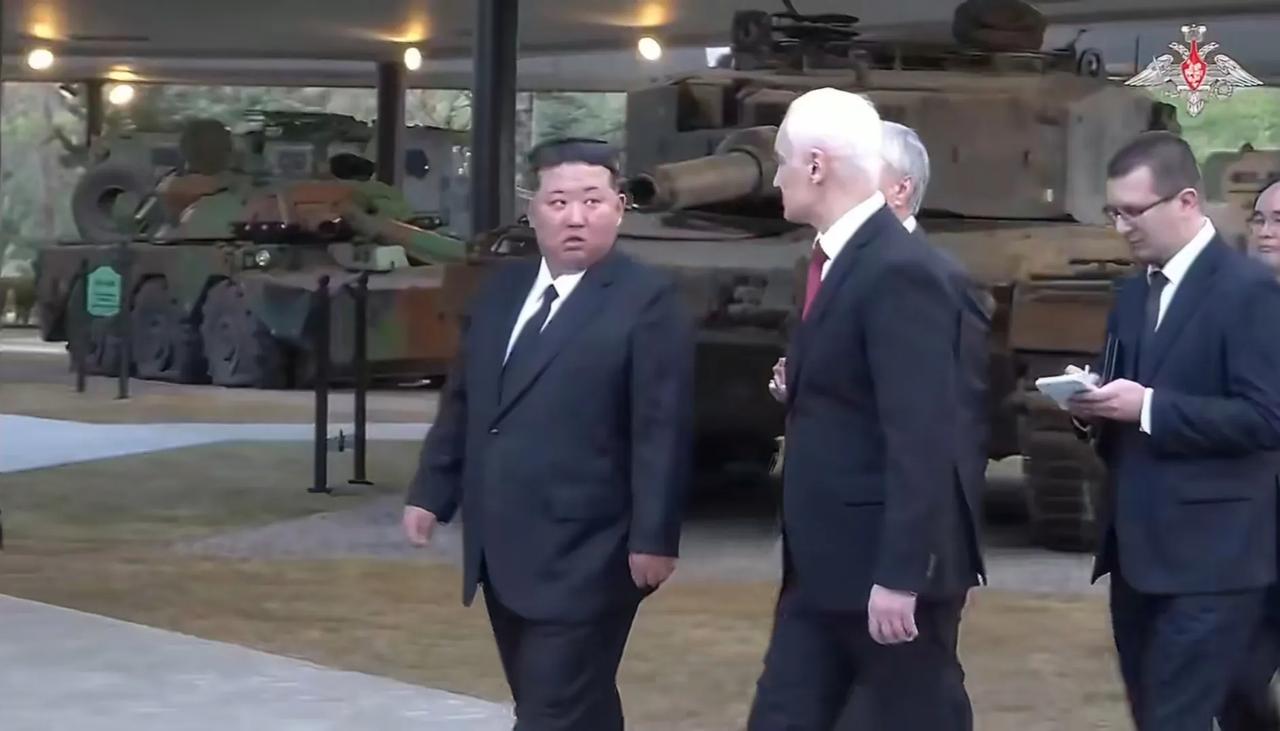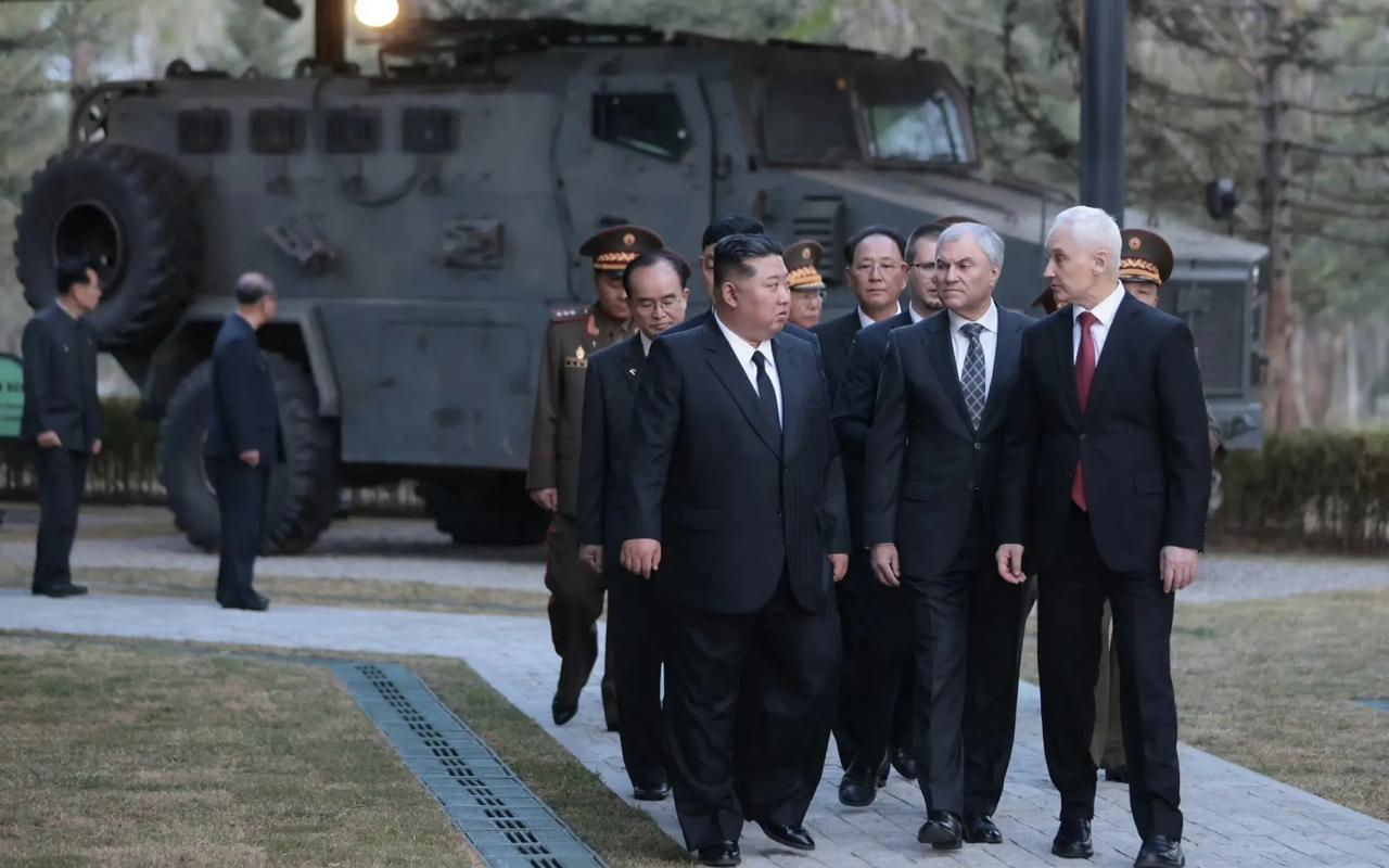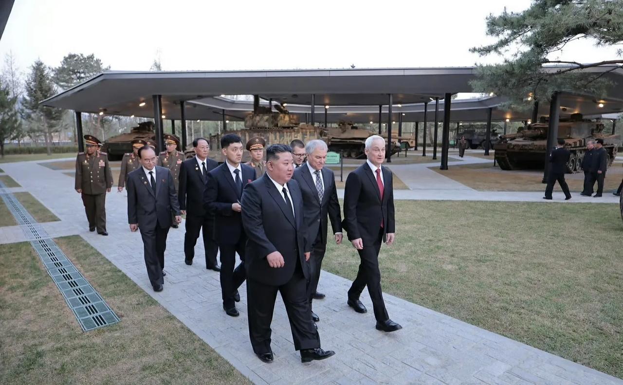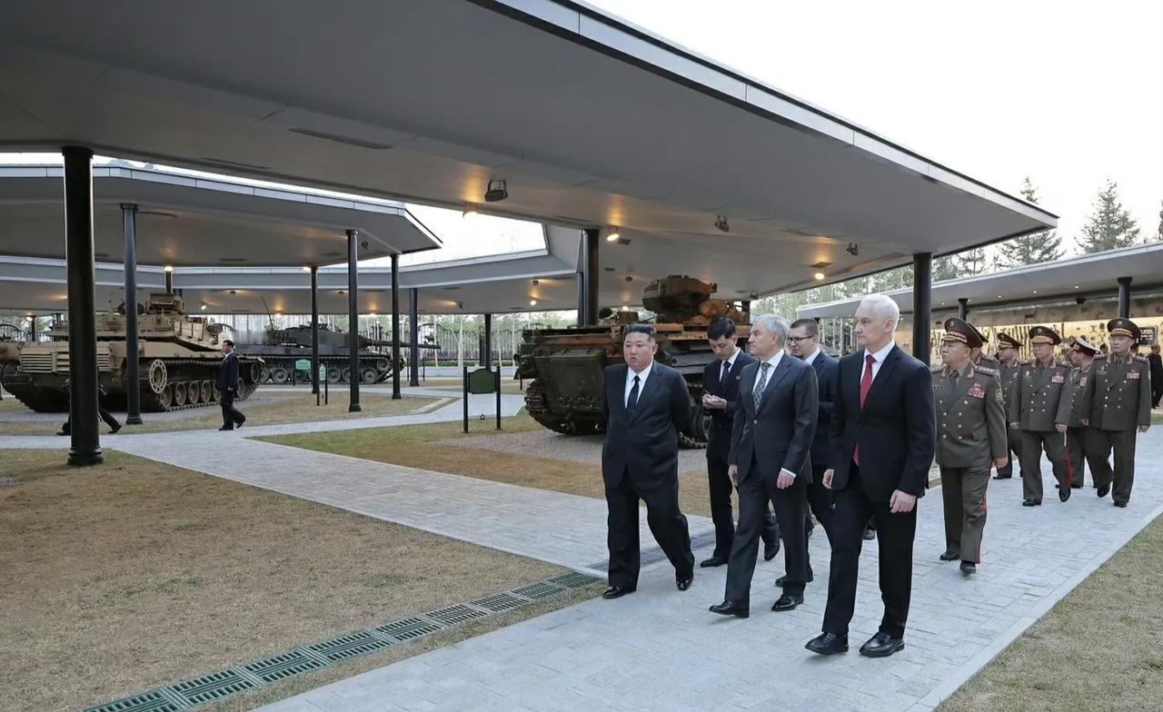 俄朝关系再进一步加深。俄罗斯联邦国家杜马主席维亚切斯拉夫·沃洛金、俄罗斯国防部长别洛乌索夫和其他俄方官员组成的俄罗斯官方代表团于25日抵达平壤,参加位于平壤的“海外军事行动功勋纪念馆”的竣工典礼。 昨天,俄罗斯国防部长别洛乌索夫出席朝方“海外军事行动功勋纪念馆”竣工典礼,别洛乌索夫在现场为朝方海外军事行动功勋纪念馆竣工剪彩。接着,别洛乌索夫与俄罗斯国家杜马主席沃洛金一起向纪念碑敬献花圈,并单膝跪地整理花圈缎带。随后,朝方领导人、别洛乌索夫和沃洛金共同视察了俄罗斯捐赠给朝方的缴获装备。 俄方在捐赠方面很大方,将俄军在战场上缴获的众多北约装备捐赠给了朝方,主要包括: 德制“豹”2A4主战坦克和“黄鼠狼”1A3步兵战车; 土耳其“刺猬”(Kirpi)防地雷反伏击车; 英国“哈士奇”装甲车; 法国AMX-10RC轮式装甲侦察车和VAB轮式轻型装甲车; 美国M1A1SA“艾布拉姆斯”主战坦克和M2A2 ODS“布拉德利”步兵战车。