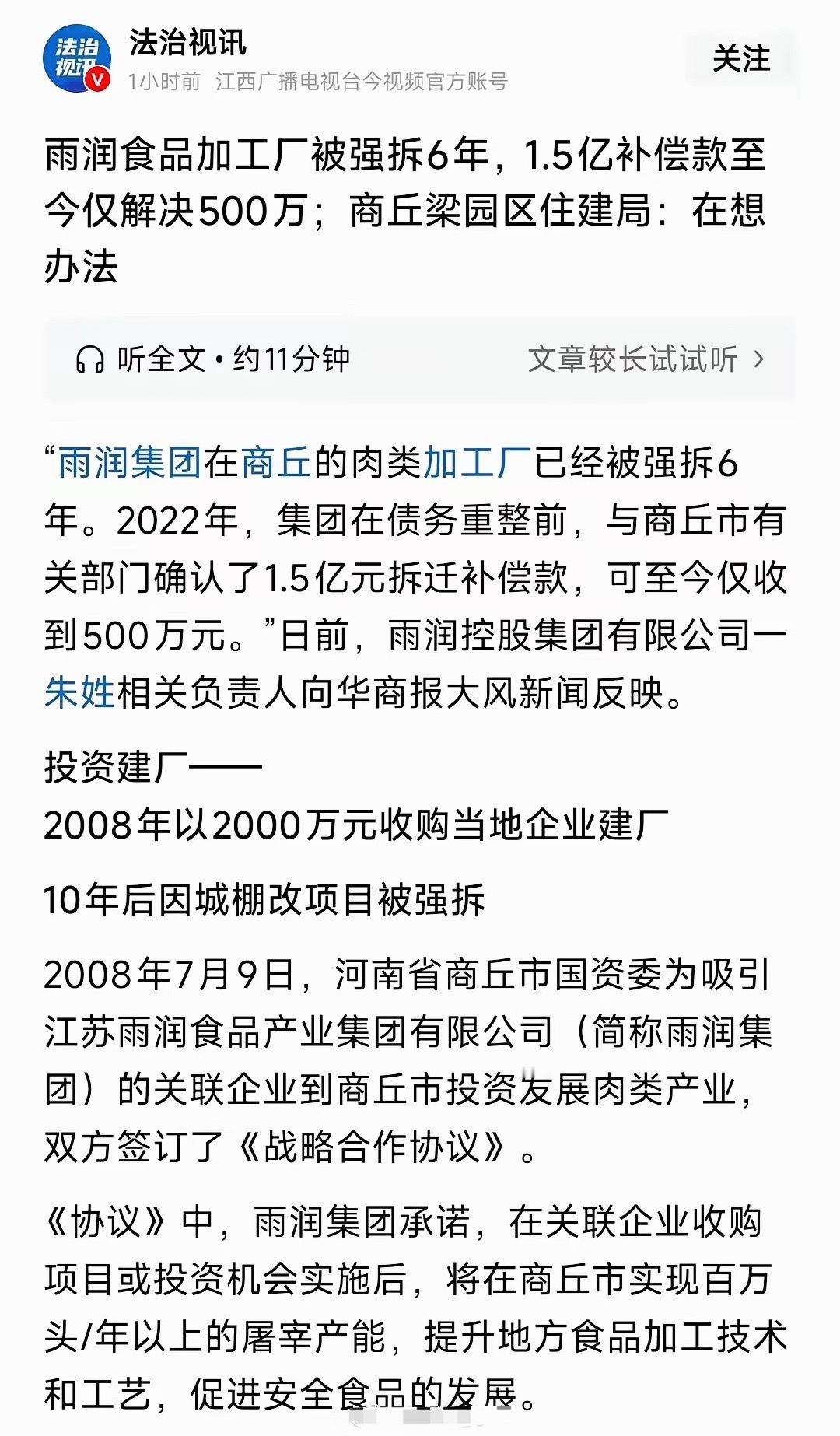 工厂被强拆1.5亿补偿款仅获500万雨润集团的食品厂被强拆6年,拆迁款现在还欠雨润集团1.5亿,至今只是解决了500万元。这种情况能申请法院强制执行吗?这个1.5亿,也是商丘中院2021年的判决。这个不是赔偿款至今没有执行,欠款是政府部门。这种情况该怎么解决,申请法院强制执行吗?有懂法律的吗?政府部门欠款,一直不还的情况下,这个怎么解决?一般常规民间欠款问题,判决后可以申请强制执行。但是个涉及到政府部门,这样的情况该怎么办?我看这篇文章当中的描述,已经多次和相关的部门进行沟通,这么多年没有解决。法院都判了,还是不执行。相关政府部门,也得按照法律进行啊!现在就是到底是权大,还是法大的问题。遇到这样的情况,该如何解决?官司都赢了,执行不了……