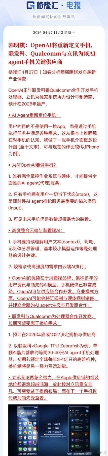 OpenAI要造手机了?郭明錤爆料:2028年量产,立讯精密独家代工!今天,知名分析师郭明錤爆料:OpenAI要亲自下场做手机!目前正联合联发科、高通开发手机处理器,立讯精密为独家整机设计与制造商,预计2028年量产!消息一出,立讯精密股价盘中暴涨近9%,市值突破5200亿。请注意:这可不是一台普通手机。郭明錤特别强调,OpenAI要做的不是“装了ChatGPT的手机”,而是一台真正的 “AI Agent手机”。现在我们手机的操作路径是:解锁 → 找App → 点开 → 完成任务。而AI Agent手机,不再是一堆App的图标集合,而是私人智能助理。你只需要告诉它“帮我订一张明天去青岛的机票”,它自己就能完成搜索、比价、支付全流程,完全不用手动切换App。这意味着,App Store的模式,可能要被彻底颠覆了!OpenAI为何亲自下场造手机?郭明錤给出了三点理由:1. 软硬一体:只有同时掌控操作系统与硬件,才能提供完整的AI Agent服务。 就像苹果自己做芯片、系统、商店一样。2. 数据闭环:手机掌握着用户最实时、最私密的状态数据, 这是AI做实时推理最关键的信息。3. 规模最大:未来很长一段时间,手机依然是全球数量最多的智能终端。说白了,OpenAI不想只当个“大脑”,它想把“身体”也做了。核心受益方向梳理:·立讯精密:明牌。郭明錤直言:“立讯无论怎么努力,在苹果供应链都很难超越鸿海,而和OpenAI的合作,是它实现弯道超车的绝佳机会。一旦OpenAI手机量产,立讯将直接拿到独家组装订单,而且AI手机的结构件、连接器价值量远高于传统手机,直接带动公司营收和利润双增。·半导体封测:联发科、高通作为处理器合作方,其AI芯片的封测订单有望流向长电科技、通富微电等A股龙头。·散热与电池:AI处理器功耗大幅提升,液冷散热、高快充电池需求将爆发,中石科技、领益智造、欣旺达等标的有望受益。·半导体设备:高端AI芯片的扩产,有望带动北方华创、中微公司等设备厂商的订单增长。OpenAI手机预计2028年才量产,现在更多是情绪催化,大家别盲目追高,真正好的风口会给再上车机会,重点关注有业绩支撑的行业龙头。A股市场今日A股股市第一线