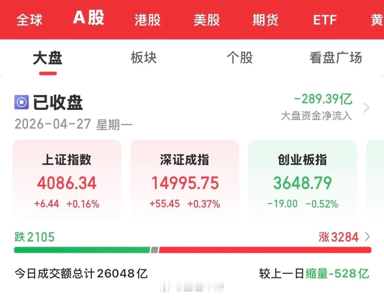 大盘资金净流出289亿,成交额2. 6万亿,缩量528亿。
