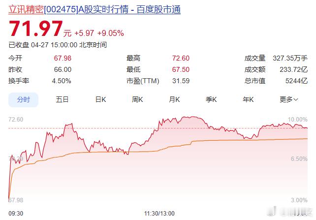 A股上演“算力狂欢”!4月27日,科创50指数半日飙涨超3%,半导体、PCB等算力硬件股集体“起飞”。立讯精密盘中一度逼近涨停,股价创历史新高,总市值突破5200亿元大关。这波行情背后,是AI算力需求爆发与5.5G/6G基础设施建设的双重驱动。立讯精密透露,公司深度布局AI算力、高速互联与光模块,一季度预增20%-22%,2025年净利166亿,成长动能强劲。看来,这不仅是股价的狂欢,更是硬科技实力的“秀肌肉”时刻。