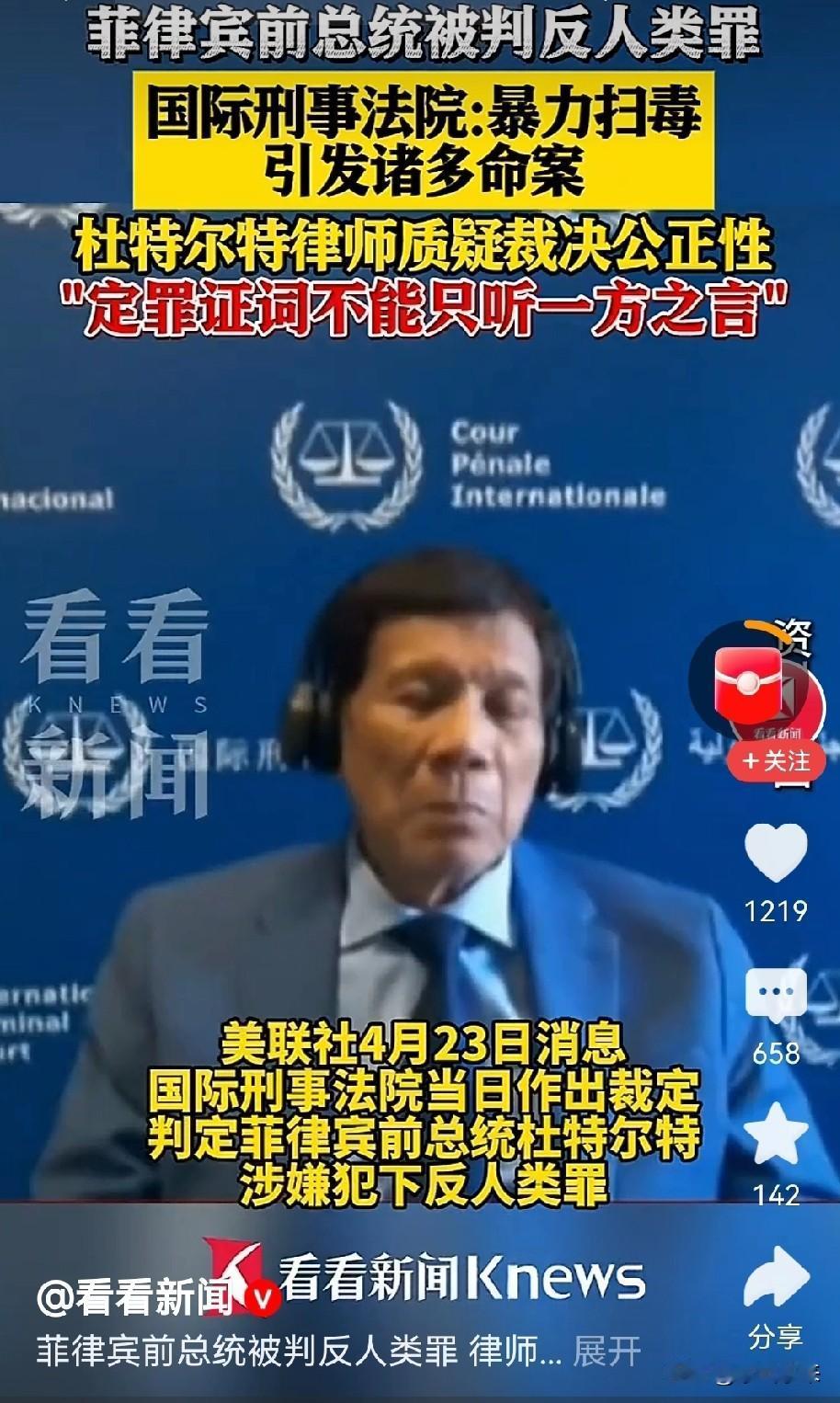 国际刑事法院正式裁定杜特尔特犯下反人类罪! 这让杜特尔特欲哭无泪,戎马一生落个晚节不保! 反观以色列总理内塔尼亚胡虽然国际刑事法院下达通缉令以反人类罪,但依然大权在握,逍遥自在! 杜特尔特估计做梦也没有想到晚年这么凄惨 杜特尔特这一生最大的功绩就是执政期间强势打击毒品。 让菲律宾国内的贩毒产业得到毁灭性打击!利国利民! 虽然带来很大的争议,但是无怨无悔! 杜特尔特为了菲律宾可谓是鞠躬尽瘁,死而后已! 杜特尔特的辩护律师称:定罪之词不能只凭一方之言! 说白了杜特尔特已经卸任了,没有实权了,也没有得到菲律宾当局政府的支持,,才落得如此境地!杜特尔特 国际刑事法院
