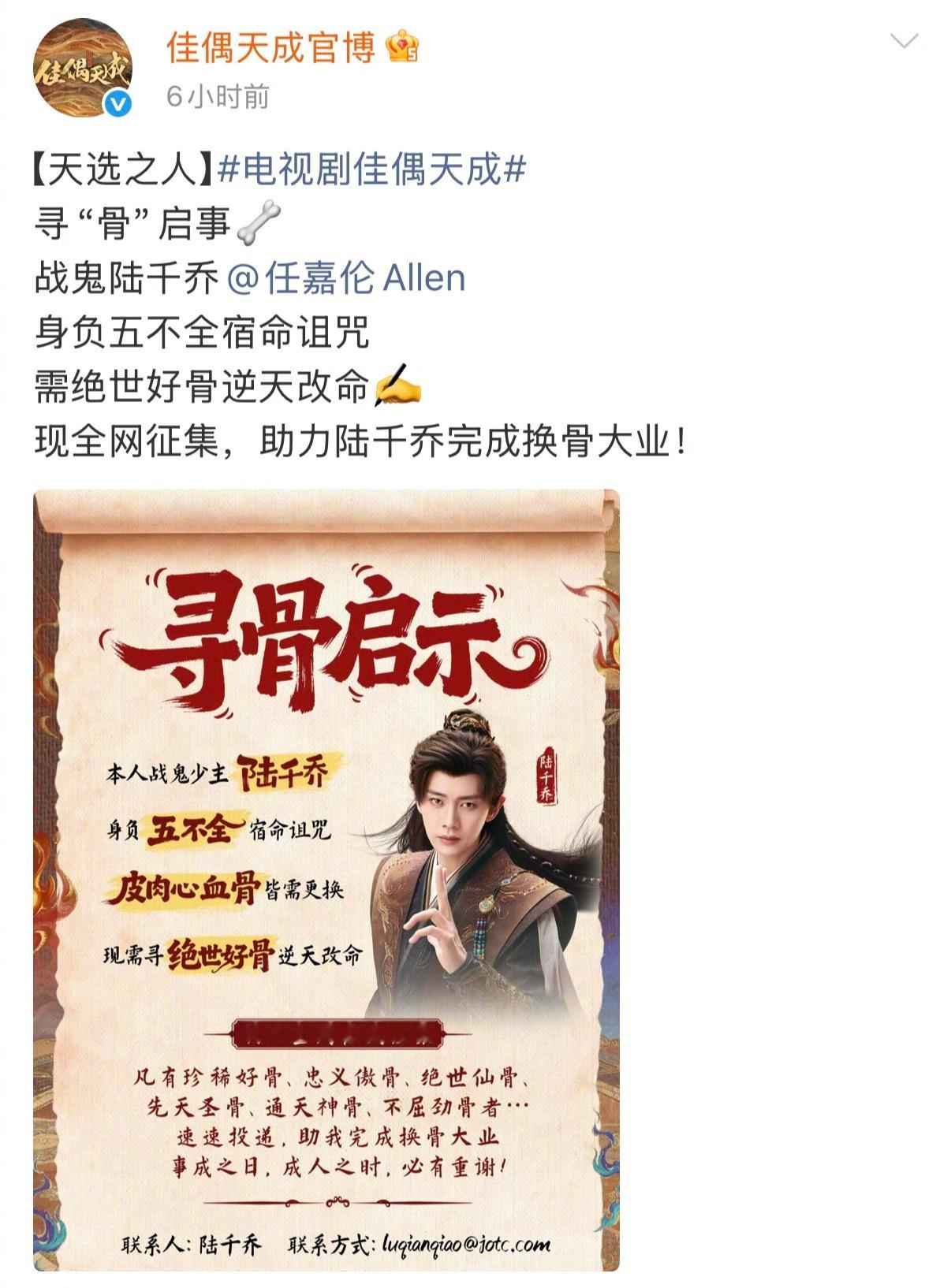 任嘉伦回应两次被郭虎削佳偶天成的编剧笑死今天刚看到这俩剧的官微联动发的都是寻骨启事电视剧佳偶天成
